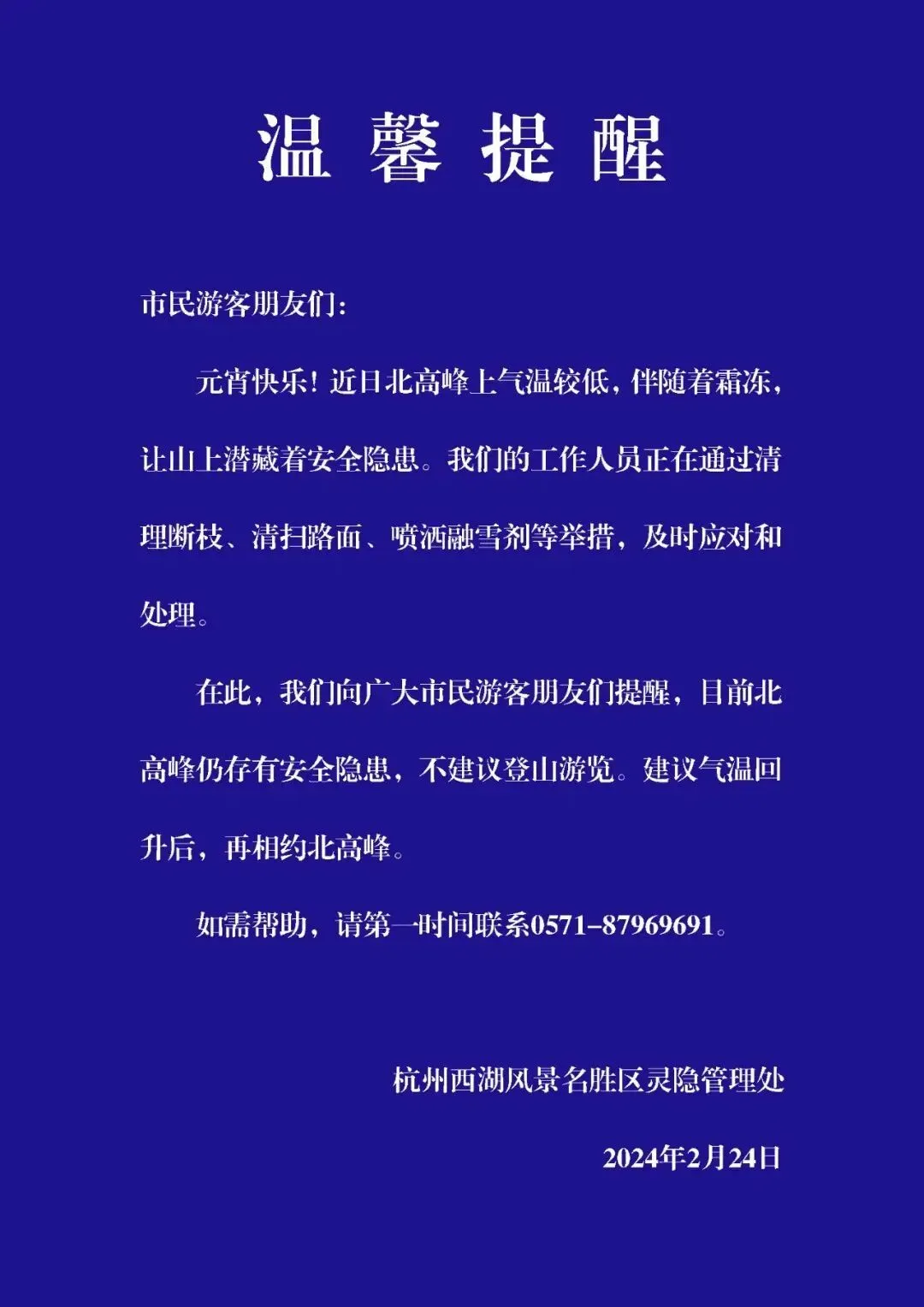 在此,灵隐管理处温馨提醒广大市民游客,目前北高峰仍存有安全隐患,不建议登山游览。建议气温回升后,再相约北高峰。