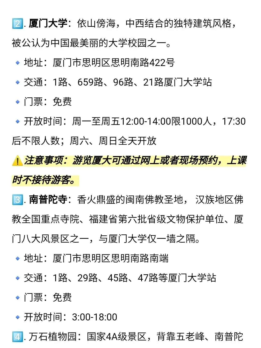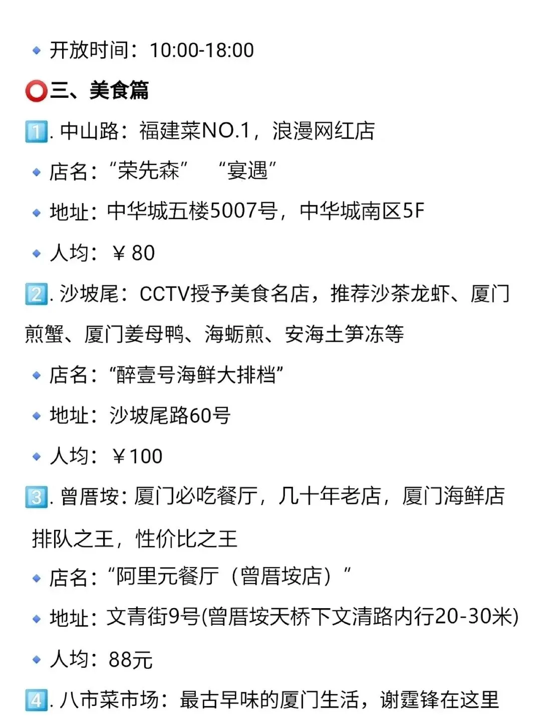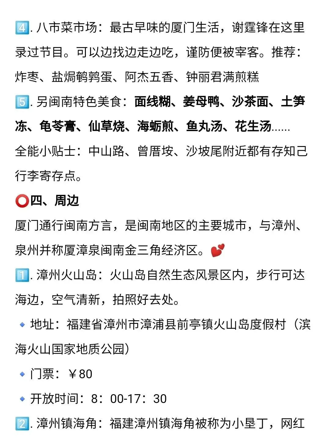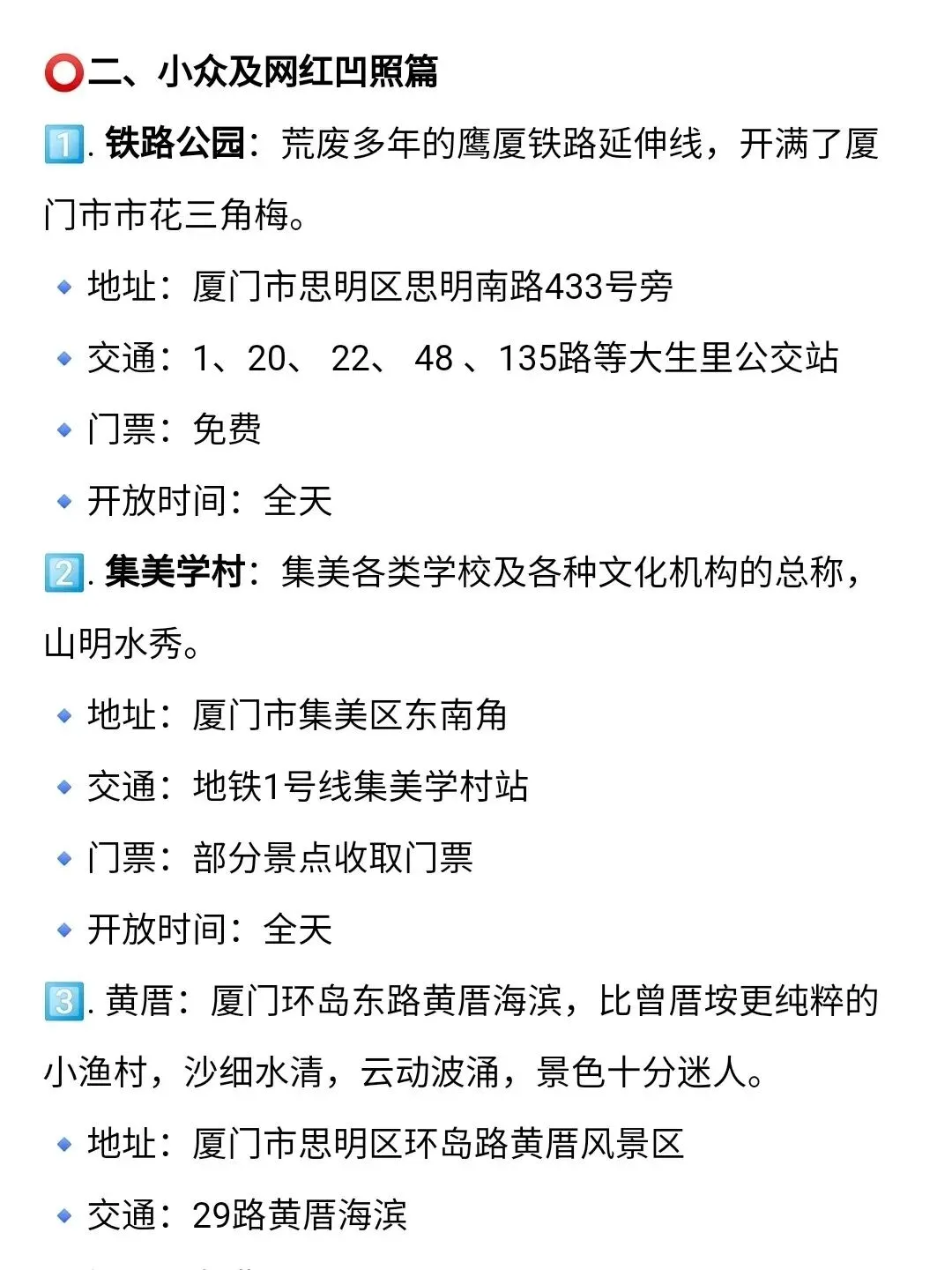 您现在的位置是:首页 > 国内旅游目的推荐 > 正文 国内旅游目的推荐 干货~史上最全厦门旅游攻略景点交通门票~ admin2026年02月13日 08:13:13国内旅游目的推荐8 干货~史上最全厦门旅游攻略景点交通门票~🌈厦门市别称鹭岛,是东南沿海重要的风景旅游城市。这里旅游业发达,自然环境优美,人文景观丰富,有特色美食——中国八大菜系之一的闽菜,独特的建筑风情随手一拍都是大照、硬照。送上厦门旅游攻略一份,各位小可爱请查收~⭕️一、首刷厦门必去 ⭕️二、小众及网红凹照景点 ⭕️三、美食篇 参考图片7-8 . ⭕️四、周边景点 #厦门[地点]# 旅行|#中山路[地点]# |#鼓浪屿[地点]# |#鼓浪屿钢琴博物馆[地点]# |#曾厝垵[地点]# |厦门旅游攻略|厦门行李寄存攻略 转载请说明来源于"旅荐网",部分内容转载自网络,如有侵权请联系qlwl@foxmail.com删除 本文地址:https://www.15386.cn/post/104326.html 上一篇 最高人民法院案例库指导案例:村民私自在景区私自上树采摘杨梅不慎跌落受伤后身亡,管理人是否承担责任? 下一篇 《旅游景区突发事件(事故)应急救援指南》DB51/T2313-2025 相关文章 第一次去中亚怎么选?我把吉尔吉斯斯坦旅游攻略整理好了 春风有信,花开有期!二二一团杏花季游玩攻略请查收 大同旅行千字美食攻略|4天打卡11家 广州番禺必打卡游玩景点|超详细(附攻略) 【学霸习惯9】预习:课前的“旅行攻略” 你的旅游产品说明书为什么总被投诉?看完这篇,下次不再踩坑! 连休3天��石河子游玩指南已为你安排! 福建环线经典7天自驾旅游攻略 福建自由行攻略 旅行计划 发表评论 取消回复 评论列表 这篇文章还没有收到评论,赶紧来抢沙发吧~