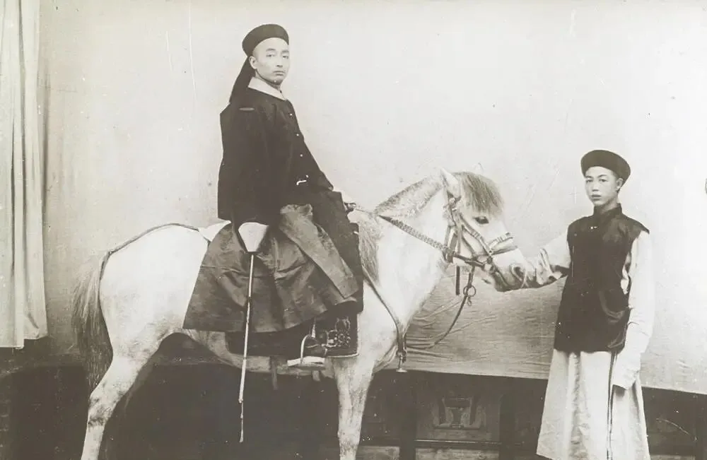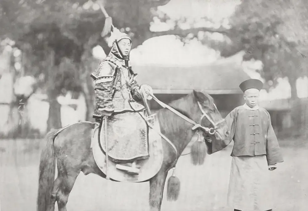 这个场景多半是照相馆里的布景马,背后帘子一拉就成了平面,青年人一襟长衫,靴筒一抹亮,旁边小厮牵缰站定,清制里说武官不得坐轿只许骑马,前朝严得很,晚清松了不少,可上镜时还是愿意照章来一回,留个体面。