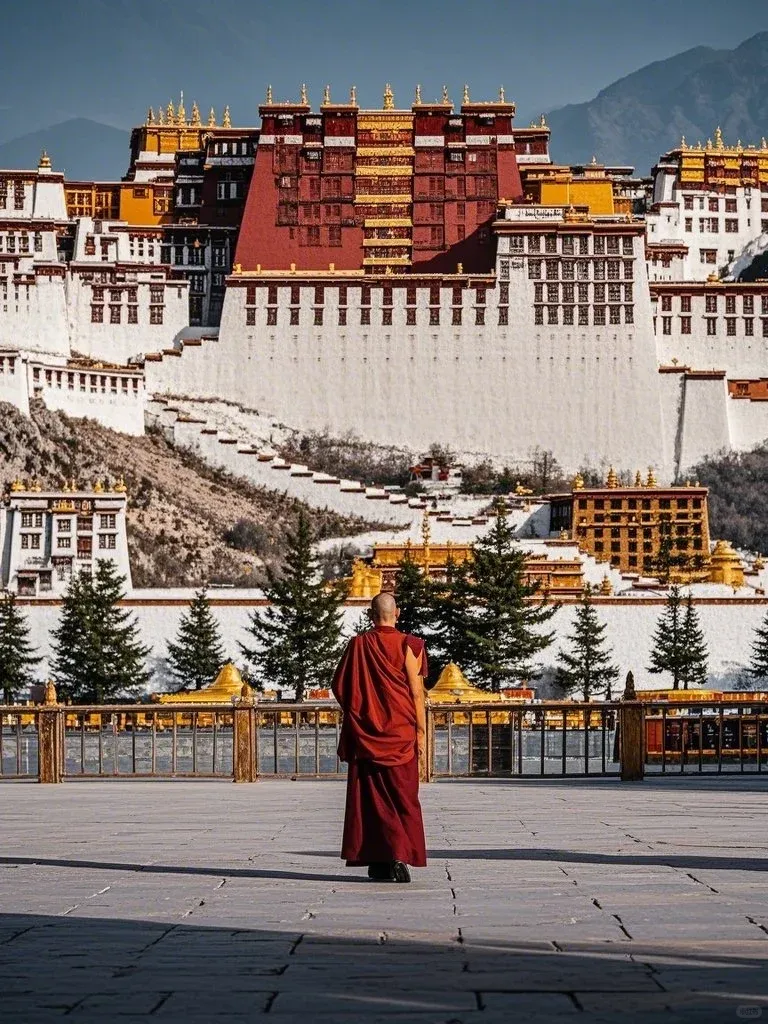 冬天的拉萨,阳光反而比夏天更通透。日光城嘛,名不虚传。站在布达拉宫广场仰头望去,金顶在蓝天下亮得晃眼——那种震撼,照片根本拍不出来十分之一。