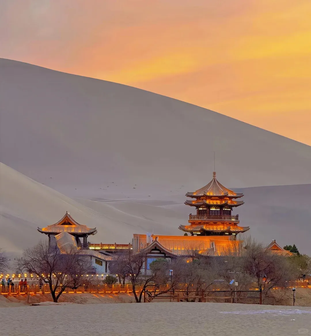 冬天的鸣沙山几乎没什么游客。你可以一个人站在沙丘顶上看落日慢慢沉下去,天边烧成大片的橘红色——那种孤独又辽阔的感觉,夏天人挤人的时候是绝对体会不到的。