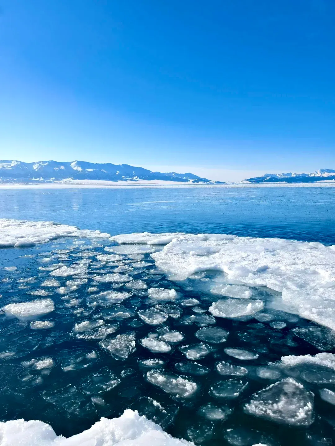 冬天的赛里木湖,直接变成了一个巨大的蓝冰奇境。