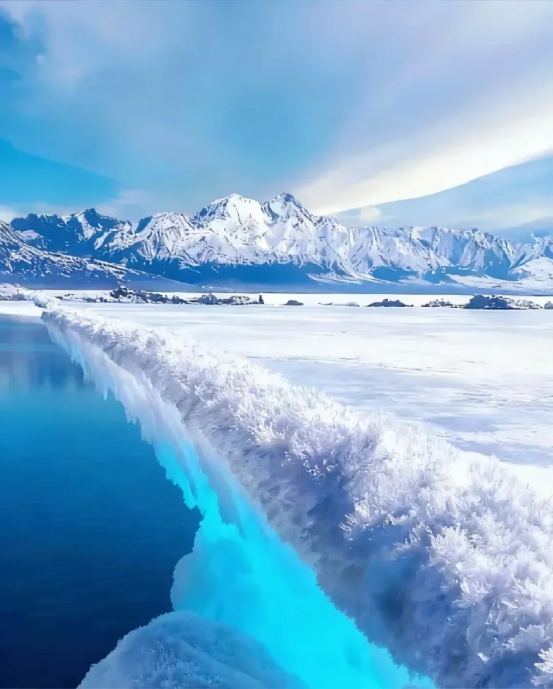 站在湖面上四周望去,天山雪峰环抱,天地之间只有蓝和白两种颜色。安静得能听到冰面偶尔发出的"咔嚓"声,那是大自然在低语。