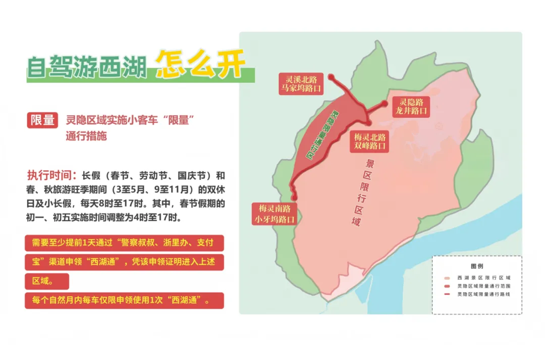 除完成景区预约外,若需驾车进入灵隐区域还需遵循“单双号”通行规则,并至少提前一天申领“西湖通”通行凭证。