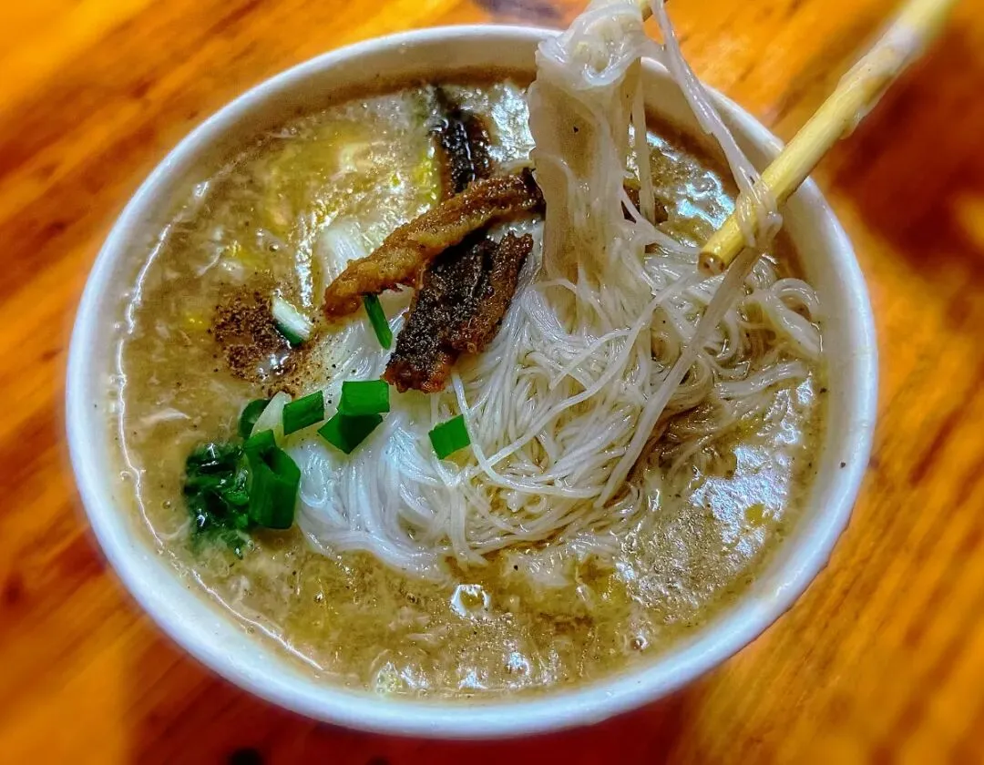 熬煮骨汤为底,手工米浆粉滑如丝,一口鲜香唤醒天门清晨。(特色在汤头与粉质)