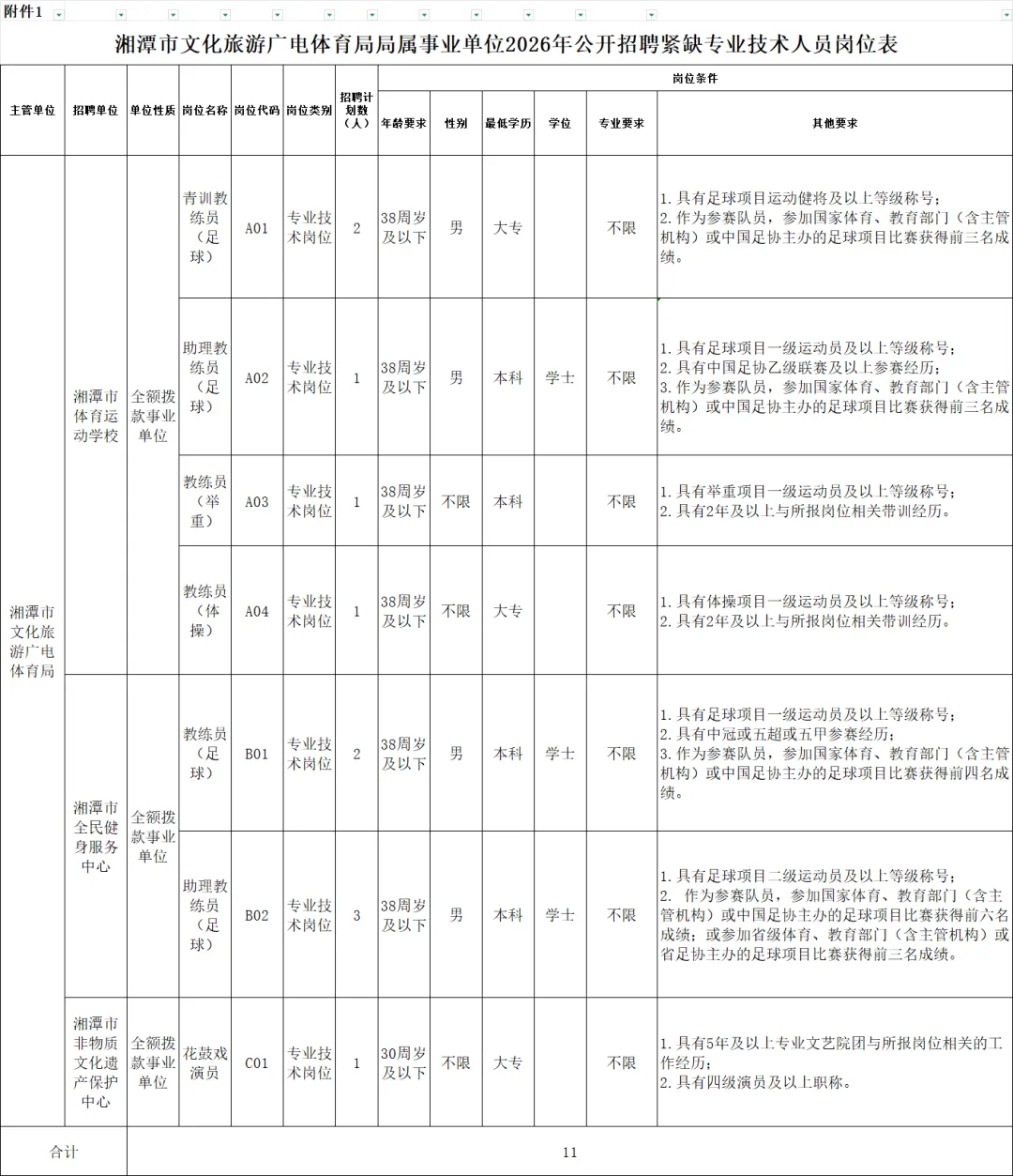 本次湘潭市文化旅游广电体育局局属事业单位公开招聘紧缺专业技术人员11名,具体招聘计划与岗位见附件1(以下简称《岗位表》)。