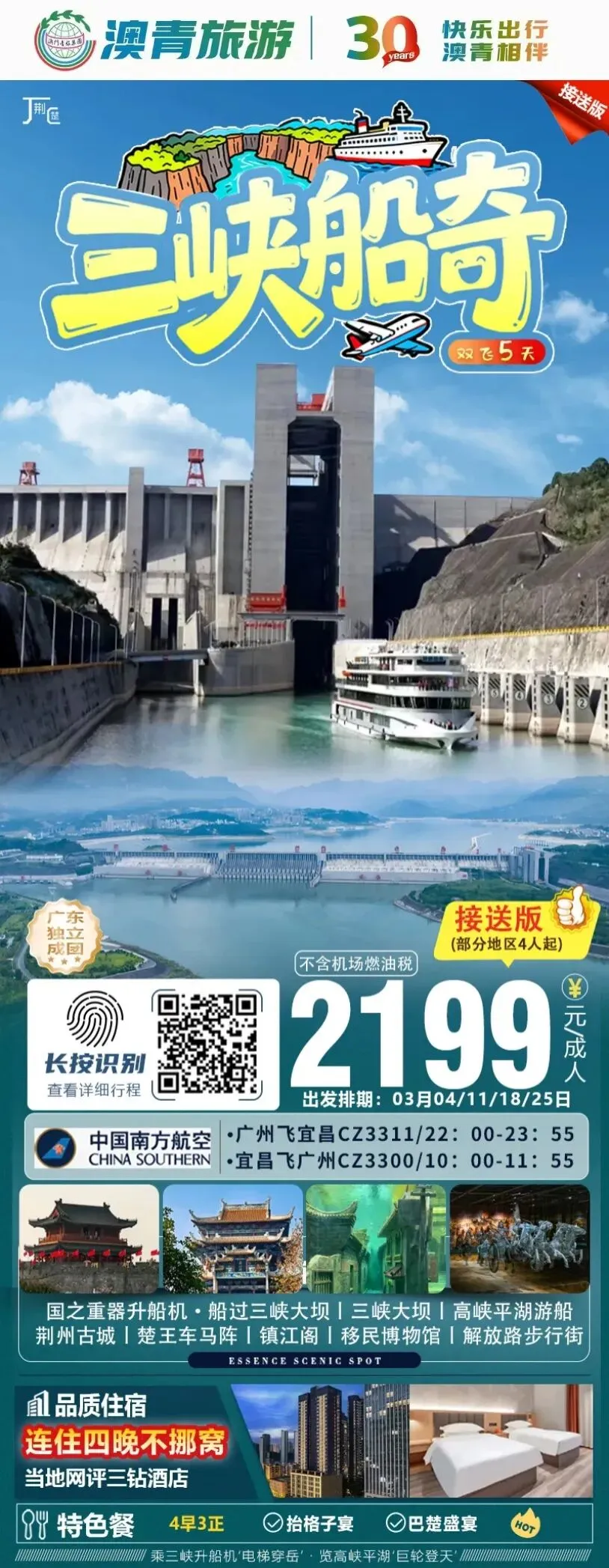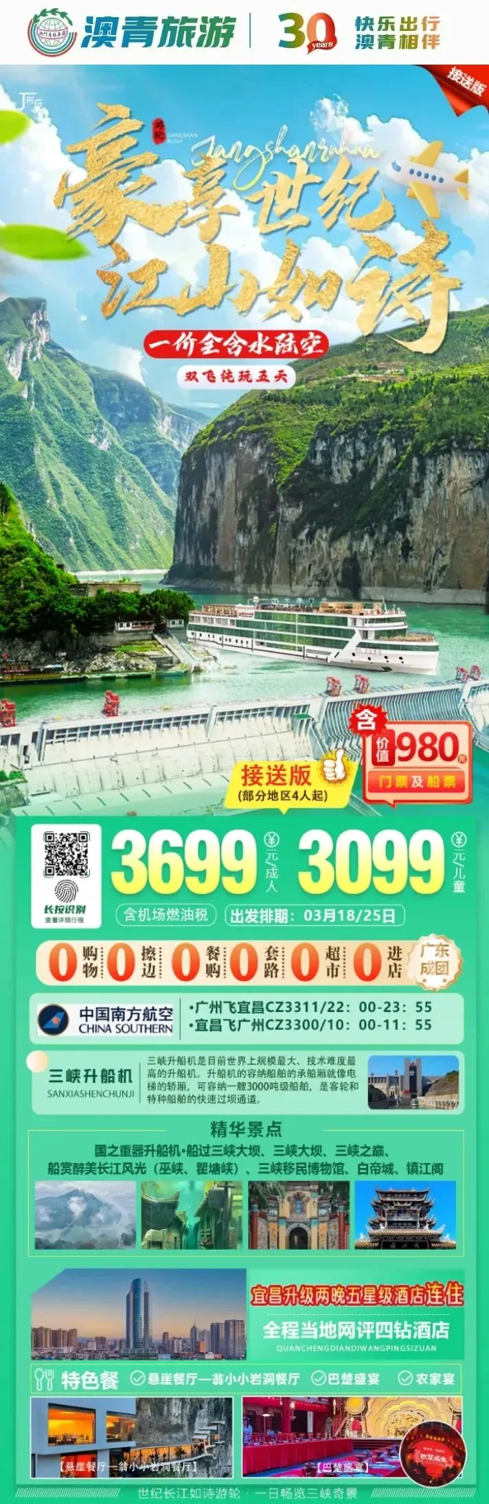 豪享高端 | 世纪江山如诗游船双飞五天 | 一价全含纯玩0购物广东自组 | 出发排期3月18/25日国之重器 | 垂直升船机船三峡大坝三峡网红 | 三峡之巅赏壮美瞿塘峡船赏醉美 | 长江如诗壮美两岸风光三国文化 |奉节白帝城了解历史文化三峡大坝 | 世界最大水利枢纽工程奢华住宿 | 两晚五星级酒店连住