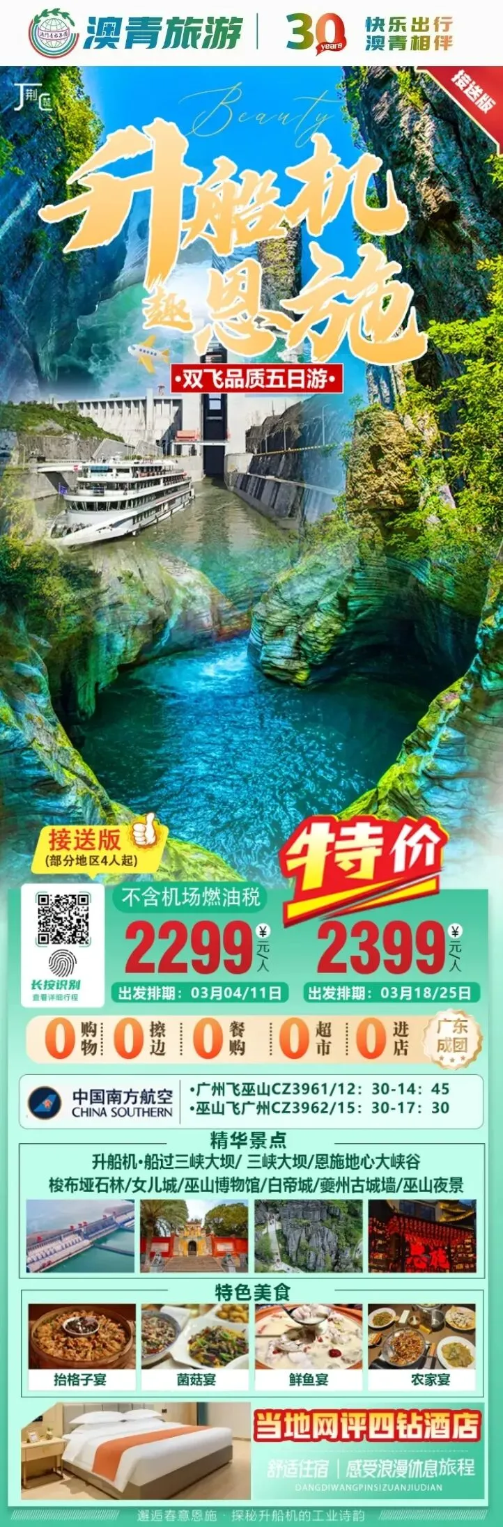 升船机趣恩施双飞纯玩五天⏰广东自组成团0304/0311/0318/0325网红恩施地心谷 |梭布垭石林 |女儿城三峡大坝收官之作|百米垂直升降升船机⭐白帝城|巫山夜景 |夔州古城墙|巫山博物馆国之重器|三峡大坝世纪伟大工程全程当地超豪 华型酒店(网评四钻)