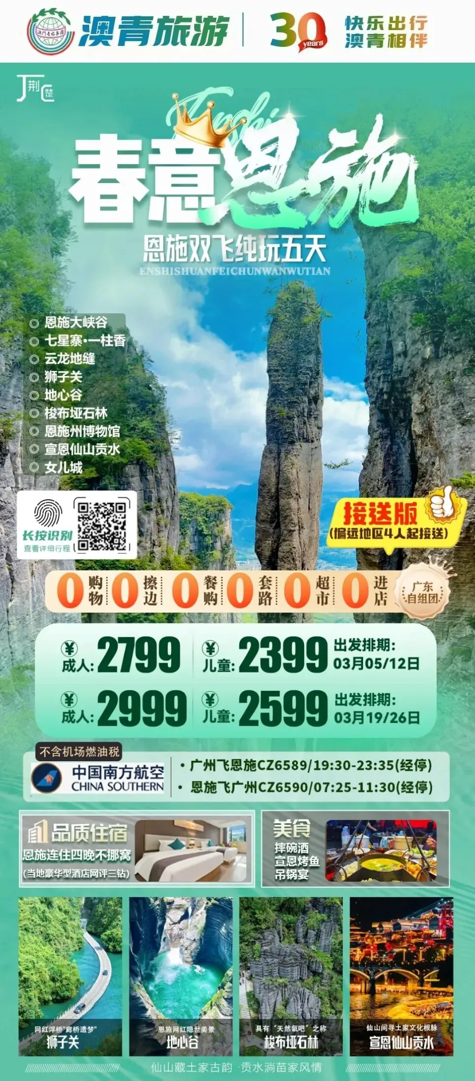 春意恩施双飞纯玩五天⏰广东自组成团0305/0312/0319/0326打卡网红穿越狮子关水上浮桥⛰恩施大峡谷全景七星寨.云龙河地缝⛰“人类第一起源地”|恩施地心谷梭布娅石林.女儿城.仙山贡水恩施连住四晚网评三钻酒店不挪窝