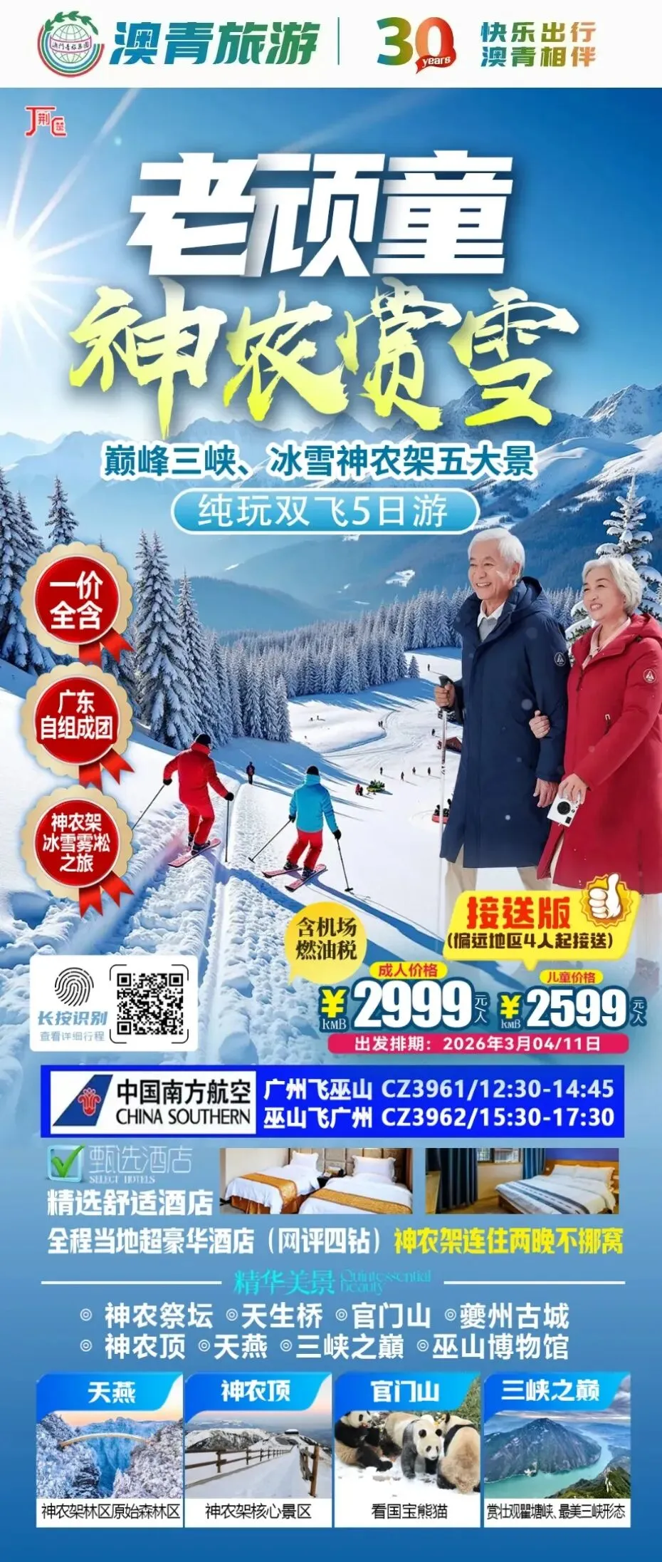一价全含老顽童神农赏雪双飞五天⏰广东自组纯玩0304/0311发班⛰三峡之巅|1388米览最美瞿塘三峡形态❄神农顶云巅云海|俯瞰白雪茫茫的壮阔❄官门山熊猫馆|与国宝共感受冬日惬意❄天生桥|冬日奇洞、奇桥、奇瀑、奇潭❄神农祭坛|祭祀炎黄子孙祖先炎帝神农氏❄探索天燕景区|感受冬日原始白雪森林全程当地超豪华型酒店(网评四钻)