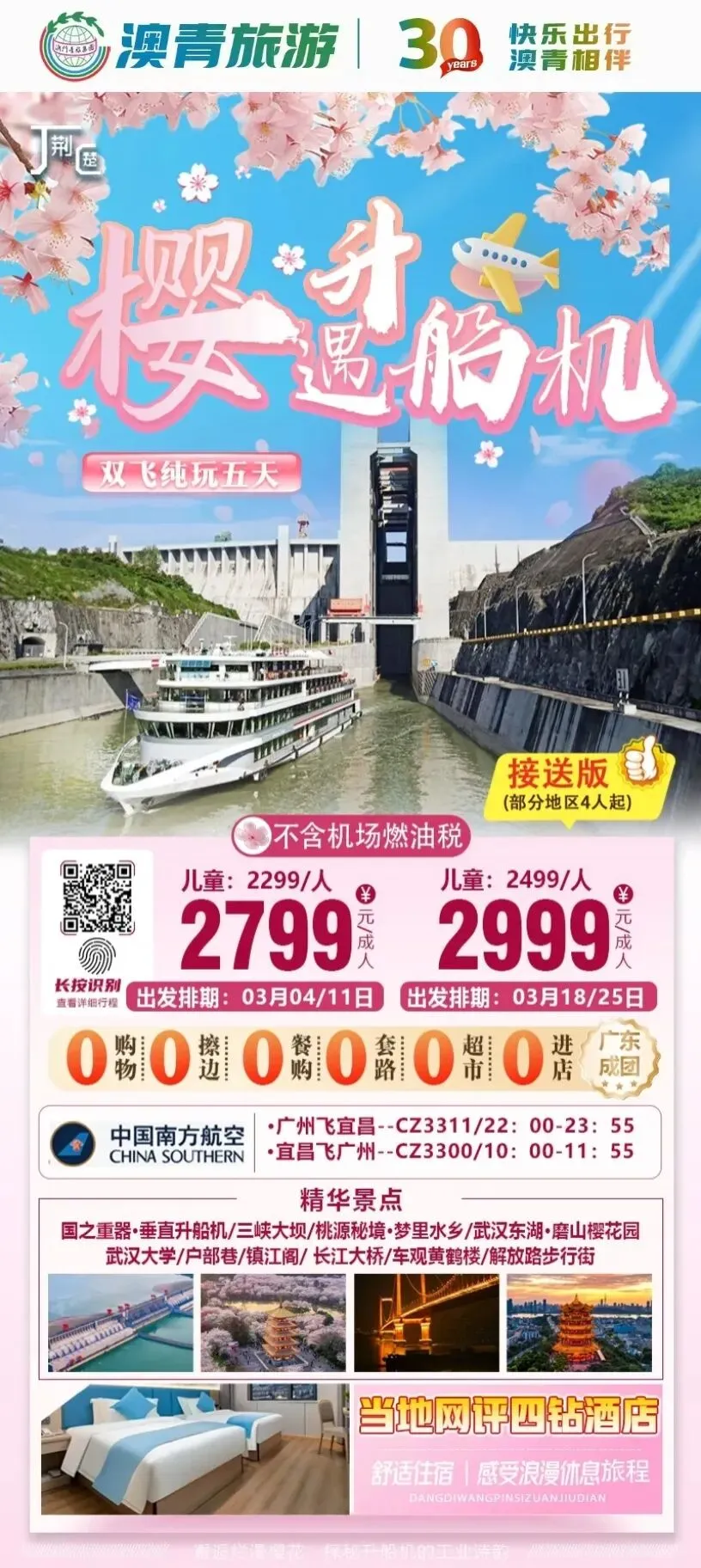 樱遇升船机双飞纯玩五天⏰广东自组成团0304/0311/0318/0325武汉东湖·磨山樱花园|三大樱花之都 三峡大坝收官之作|百米垂直升降升船机⭐桃源秘境|仙桃梦里水乡|自然美景休闲国之重器|三峡大坝世纪伟大工程⭐武汉大学|户部巷|镇江阁|长江大桥全程当地超豪 华型酒店(网评四钻)