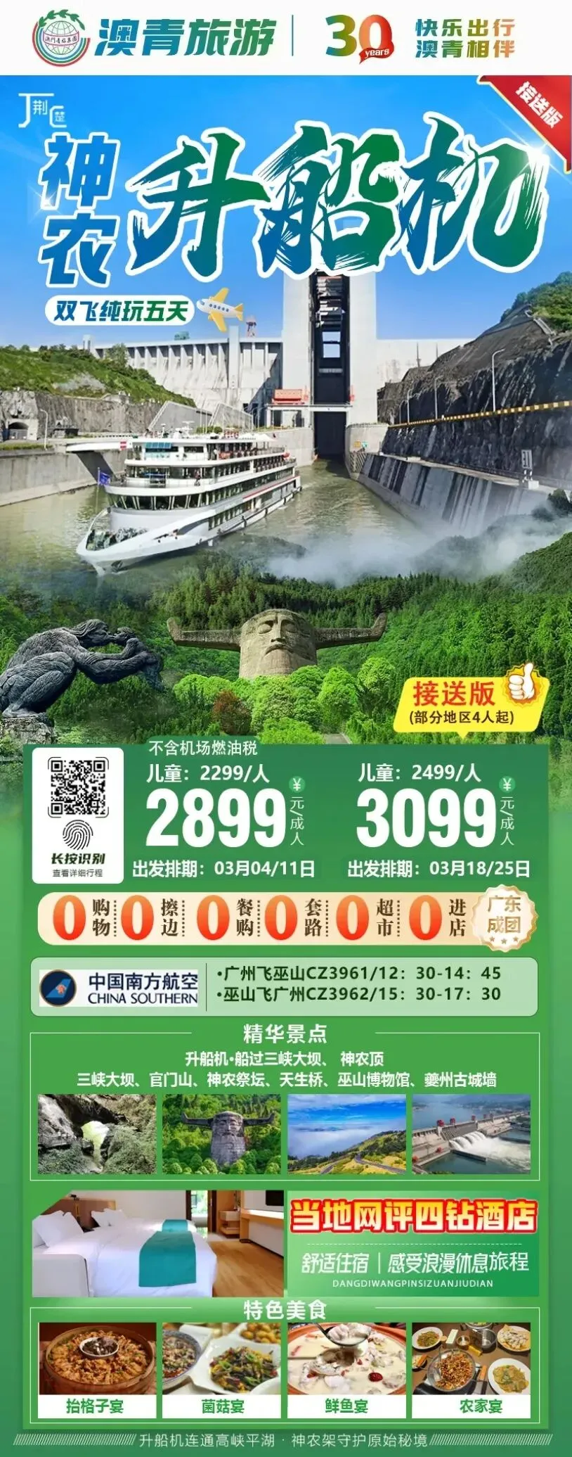 神农升船机双飞纯玩五天⏰广东自组成团0304/0311/0318/0325神农顶云巅森林|俯瞰层林云海 三峡大坝收官之作|百米垂直升降升船机⭐官门山 |天生桥 |神农祭坛|巫山博物馆国之重器|三峡大坝世纪伟大工程全程当地超豪 华型酒店(网评四钻)