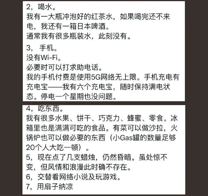 牠发文说,没有电灯,那就用蜡烛来照明;喝不着冰饮那就喝红茶;没有WIFI那就用流量;做不了饭那就吃零食;看不了电视那就看小说;用不了空调那就用扇子纳凉……