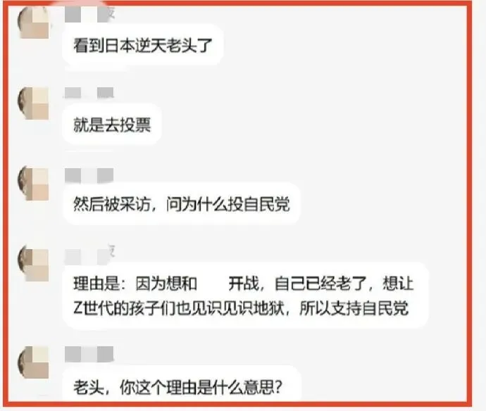 这个老头说——我投票给自民党,就是想让日本和某东大开干。因为自己已经老了,想让日本的那些Z世代的孩子们,也见识见识地狱的样子。