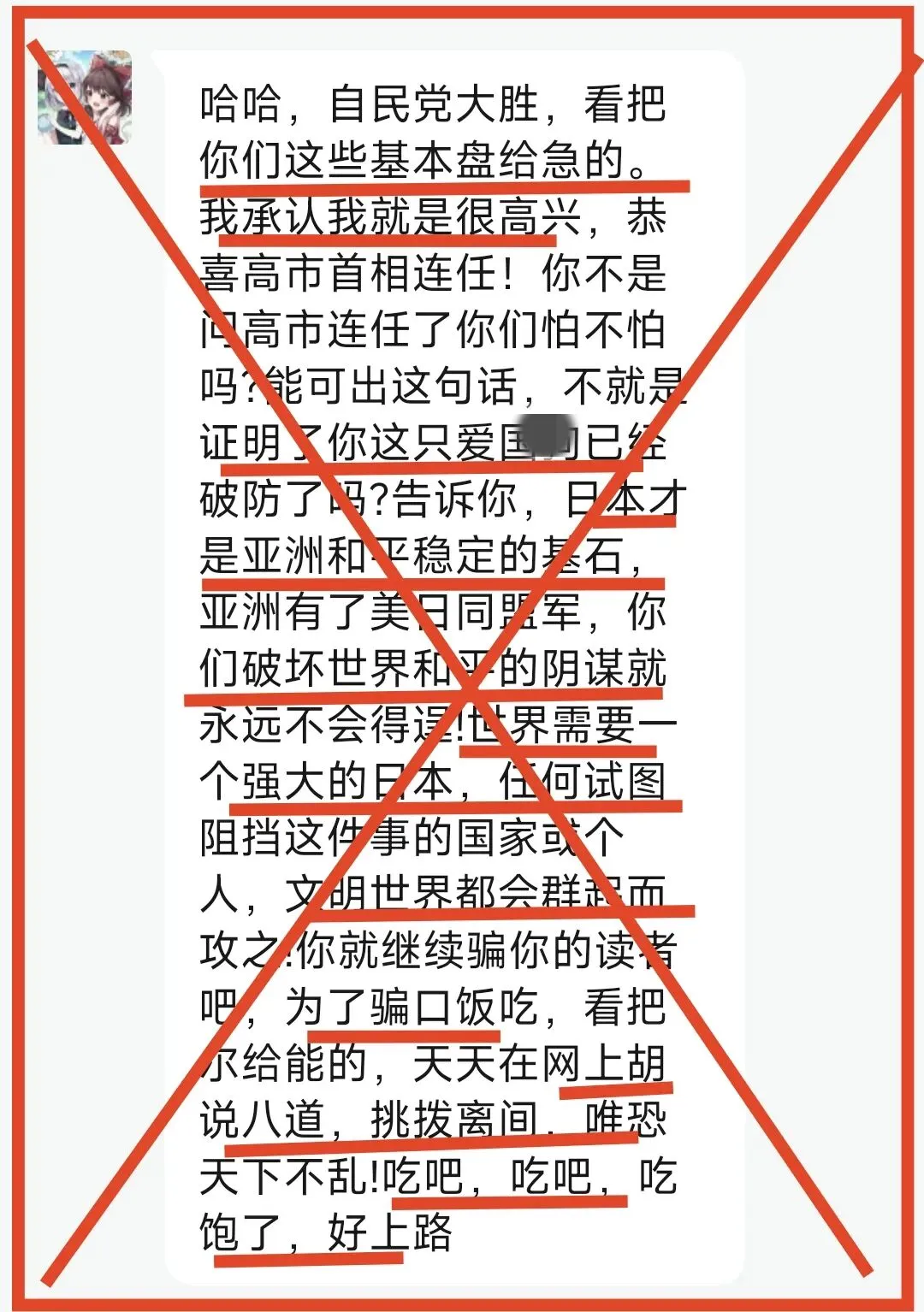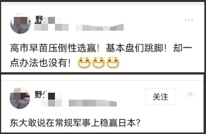 比如,网上一个铁杆秋田便在高市连任后对东大网友各种嘲讽,道——“高市早苗压倒性选赢!基本盘们跳脚!却一点办法也没有,哈哈哈!”“东大敢说在常规军事上稳赢日本?”