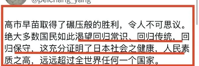 牠通过自己的所看、所感,得出一个观点——“绝大多数(日本)国民如此渴望回归常识、回归传统,回归保守,这充分证明了日本社会之健康,人民素质之高,远远超过全世界任何一个国家。”
