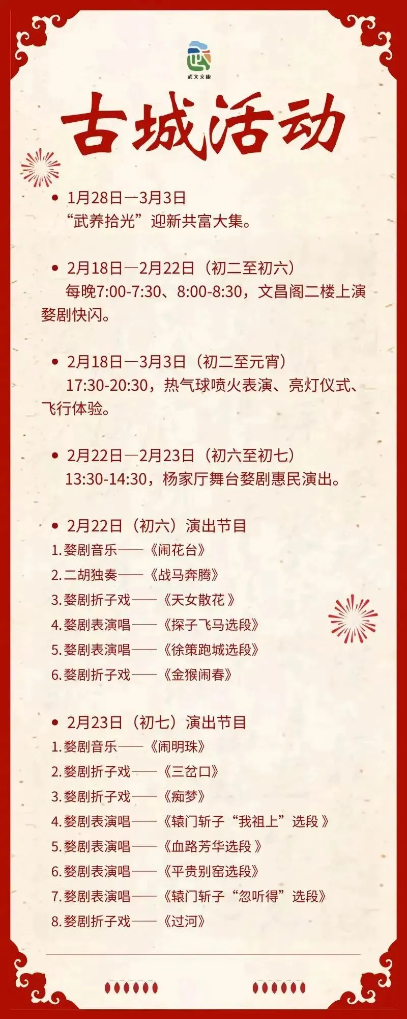 古城:1.28—3.3武养拾光·古城迎新共富大集,花市、潮玩、美食7大主题轮转,还有婺剧折子戏在文昌阁实景上演。
