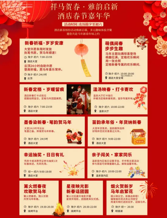 酒店作为度假区接待核心,建成234间差异化客房(含208套景观房、45套私汤别院、3栋隐奢山居),每间别院均配置独立汤池与无边泳池,实现“推窗见山、入户享泉”;联动完成139个室内外温泉泡池、8000㎡恒温热带雨林馆(含龙卷风暴滑道、百鸟馆、蝴蝶馆)建设,配套6大主题餐厅与1100㎡无柱宴会厅,形成单日5000人次的接待能力,可满足亲子度假、商务会议、婚宴庆典等多元需求。春节期间,热市温泉旅游度假区邀您共赴马年新春年味之约。