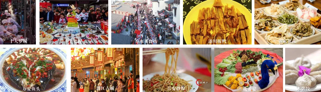 线路安排:永新“十大罗碗”(南门老街、秀水美食坊)——遂川客家美食(桃源梯田、草林红圩小镇)——万安全鱼宴(万安湖)——永丰霉菜(恩江古城)——峡江孔雀宴等民族特色美食(金坪民族风情小镇)