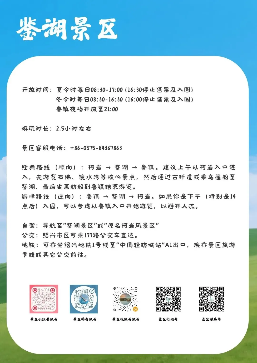 二、景区将启动免费接驳车辆。停车至祥生临时停车点的游客朋友,鉴湖景区将进行免费往返接驳(路线:鉴湖景区——祥生临时停车场)。