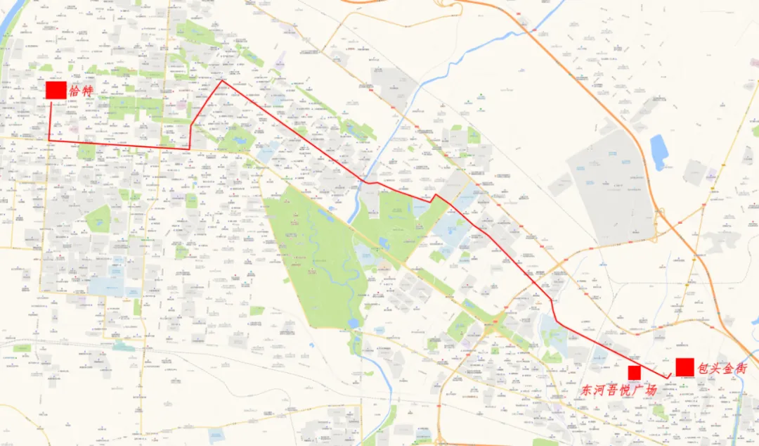 恰特公交站—白云路—钢铁大街—富强路—文化路— 青山路(东河区吾悦广场)—包头金街