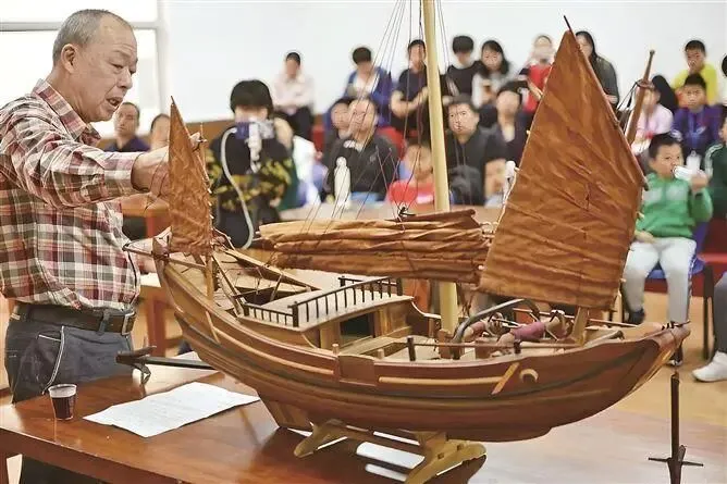 “福船”是最早把指南针用于海上航行的海船。闽南地区在宋元时期是“福船”建造中心,厦门成为五口通商口岸后,造船、修船业繁荣。后来,“福船”逐步退出历史舞台,为了弘扬传统海洋文化、舟船文化,传承祖辈的造船工艺,福建古船模制作技艺传承人杨育锥积极参与宋代“华光礁一号”福船的重造工程,并于近20年精心制作了大批“福船”模型。