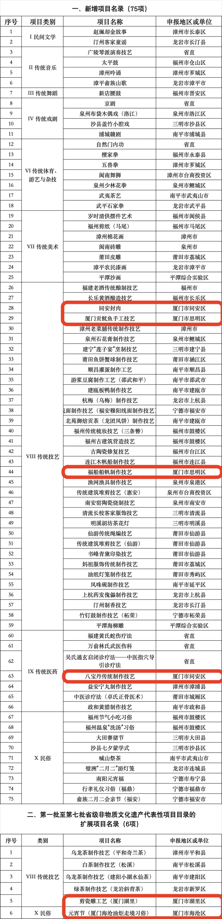 其中,新增项目名录75项,厦门4个项目上榜,包括传统技艺类的同安封肉、厦门贡鱿鱼手工技艺、福船船帆制作技艺,传统医药类的八宝丹传统制作技艺;扩展项目名录6项,厦门2个项目上榜,分别是传统技艺类的剪瓷雕工艺(厦门湖里)和民俗类的元宵节(厦门海沧油炬走境习俗)。