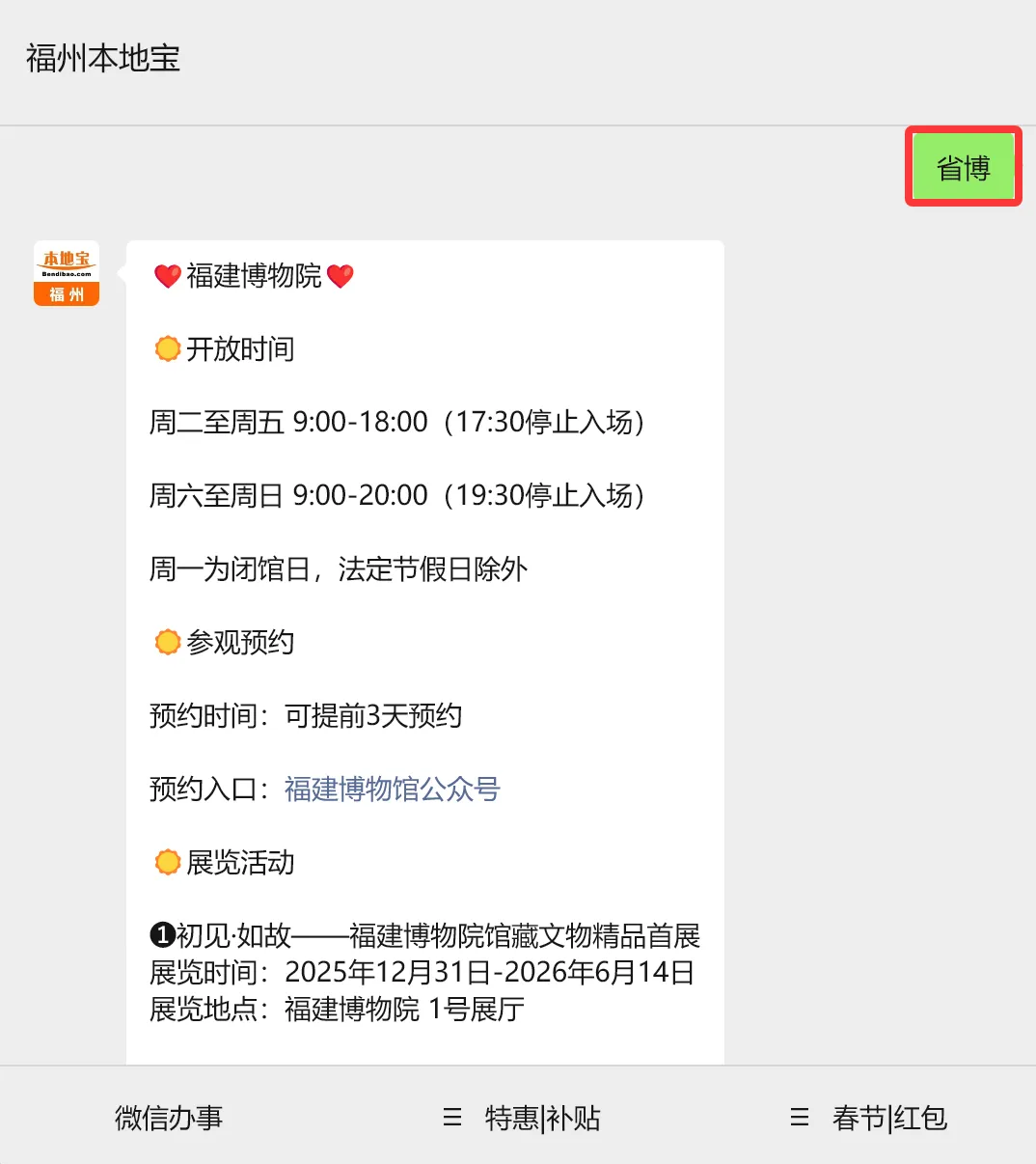 ⭐推荐服务:扫描下方二维码进入【福州本地宝】,在微信对话框回复【省博】也可获取福建博物院门票预约入口(注:本地宝非场馆官方,仅提供官方入口)