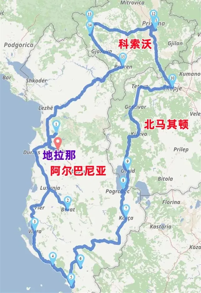 [路线图:地拉那(Tirana,开始)— 克鲁雅(Kruja,1)— 贝拉特(Berat,2)— 发罗拉(Vlora,3)— 希玛拉(Himara,4)— 萨兰达(Saranda,5)— 吉诺卡斯特(Gjirokastra,6)— 科尔察(Korça,7)——圣瑙姆(Saint Naum,8)— 奥赫里德(Ohrid,9)— 斯科普里(Skopje,10)— 格拉查尼察(Gračanica,11)— 普里什蒂纳(Pristina,12)— 佩奇(Peć,13)— 德查尼(Dečani,14)— 普里兹伦(Prizren,15)— 地拉那(结束)]