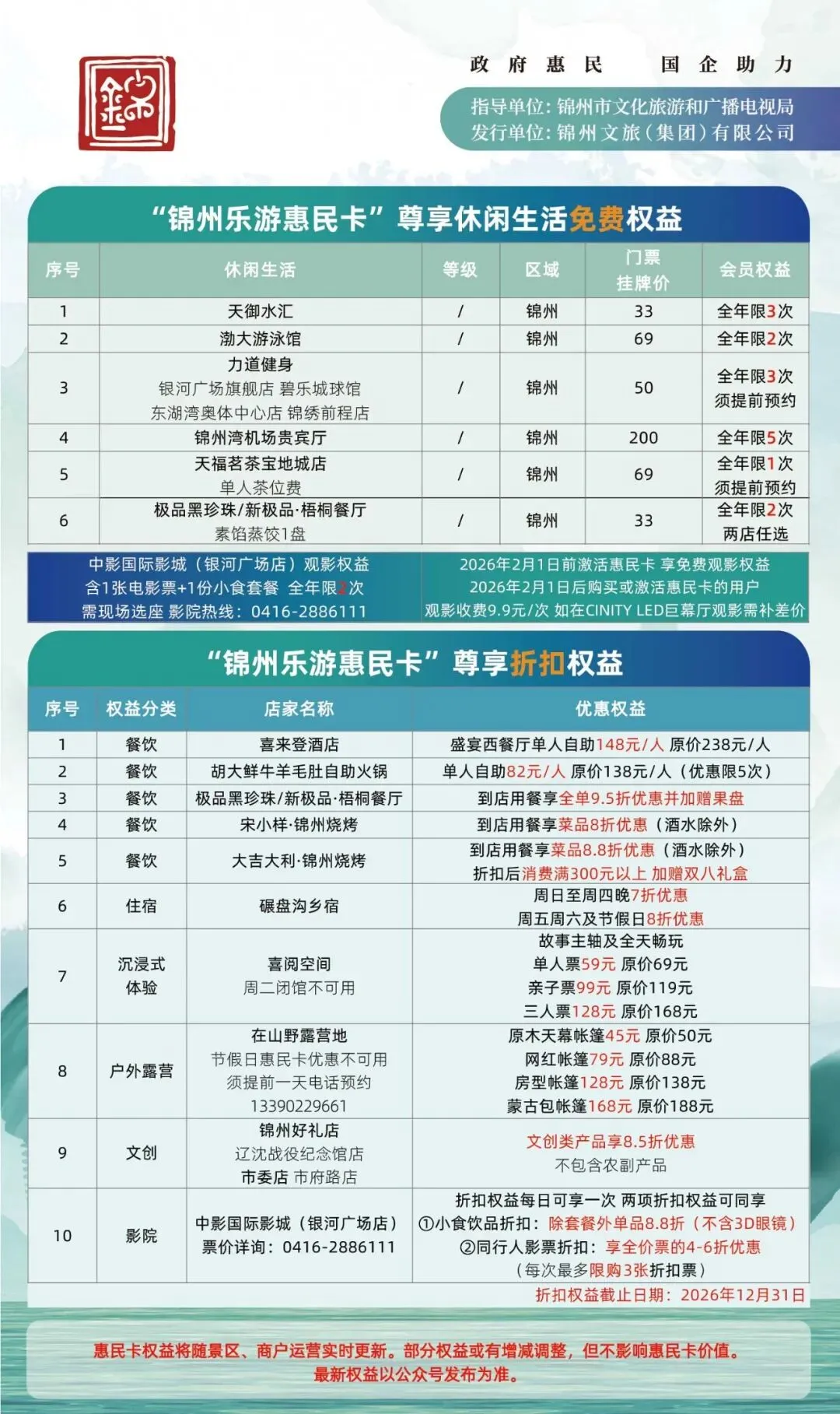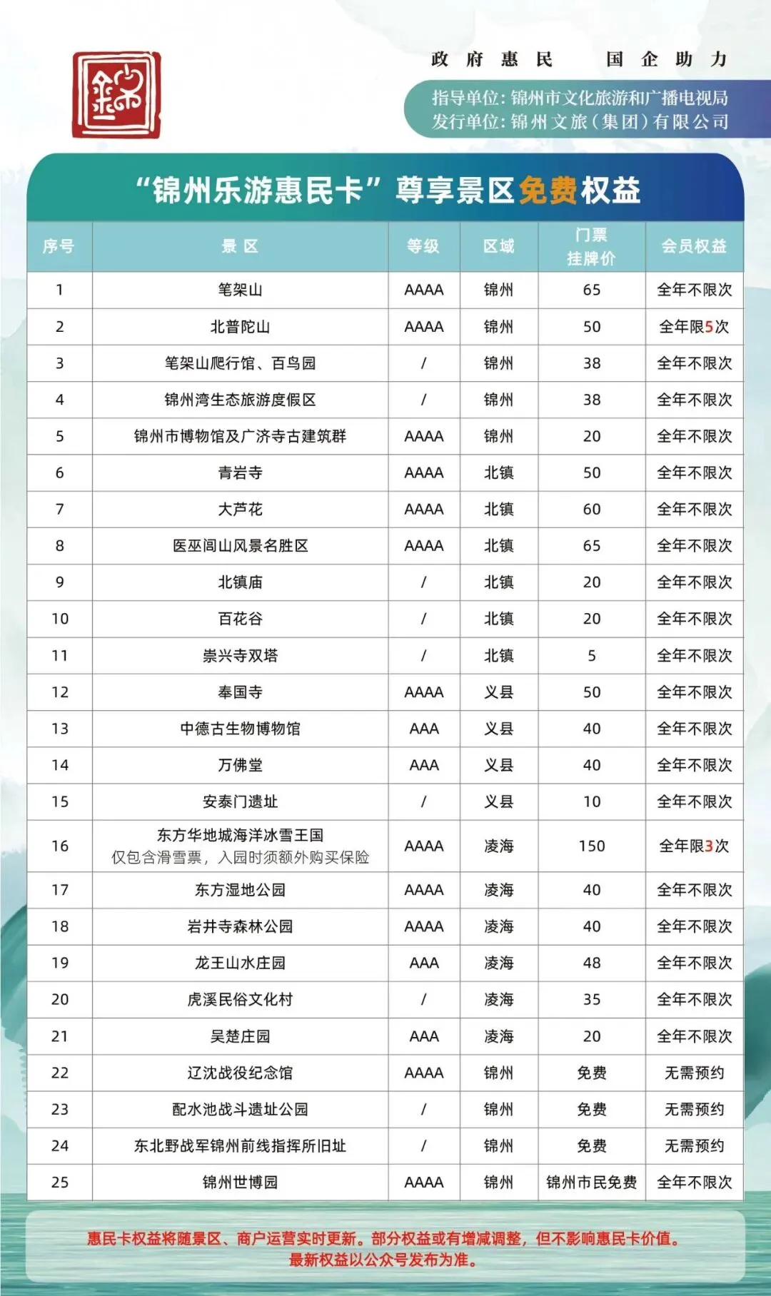 锦州 25家重点景区 全年免费畅游 还能免费尊享 电影 洗浴 健身 贵宾候机 以及 餐饮特惠权益 全部景区门票和权益总价超千 元