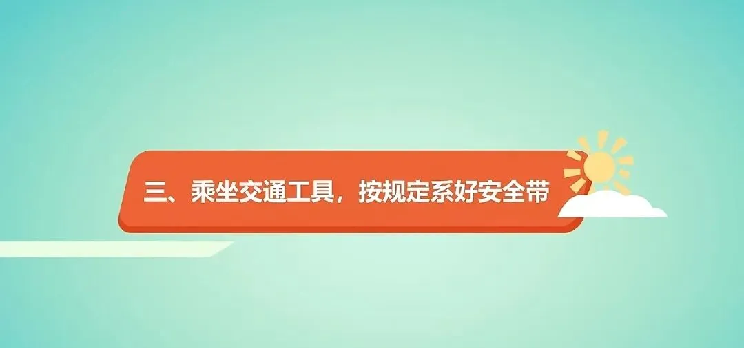 乘坐交通工具,按规定系好安全带。安全带是关节时刻的“保命带”,驾车乘车出行一定要全程系好安全带。