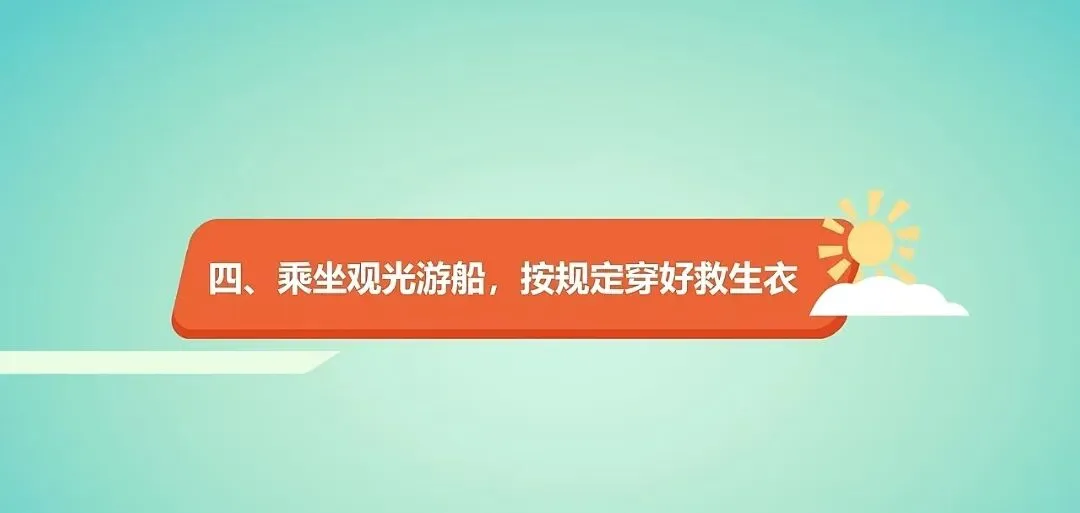 乘坐观光游船,按规定穿好救生衣。游船赏景正当时,救生衣按规定穿好,不可忽视。千万不要乘坐未配备救生设备的观光游船。
