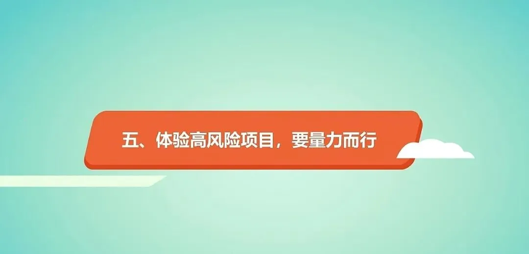 体验高风险项目,要量力而行。根据个人年龄和身体状况,谨慎参与高空、高速、水上等高风险项目,听从专业人员指导。