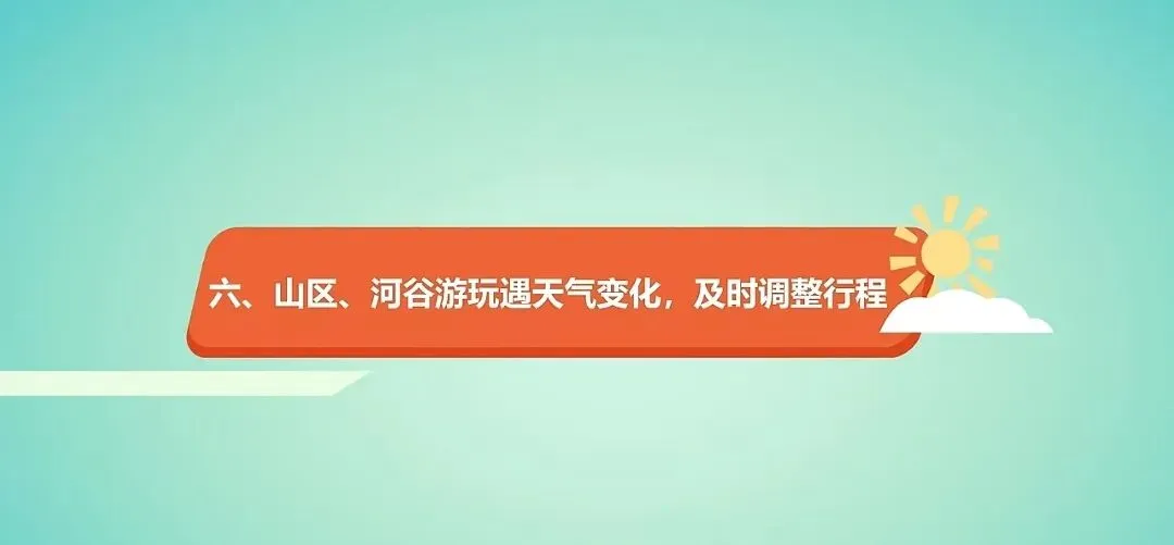 山区、河谷游玩遇天气变化,及时调整行程。山区、河谷赏风景,遇到天气变化千万别大意,要警惕山体滑坡、落石、泥石流、山洪爆发等自然灾害带来的风险。根据天气状况和预警提示,及时调整行程。