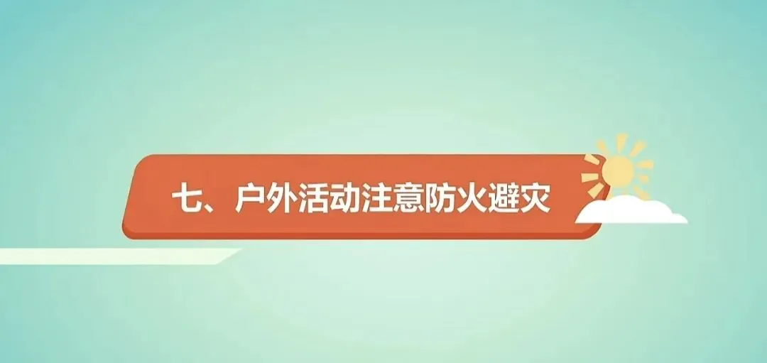 户外活动注意防火避灾。户外游玩不带火种上山、不在草木繁盛、树叶堆积等易燃聚集地或有防火提示的地方吸烟、烧烤或者使用明火。