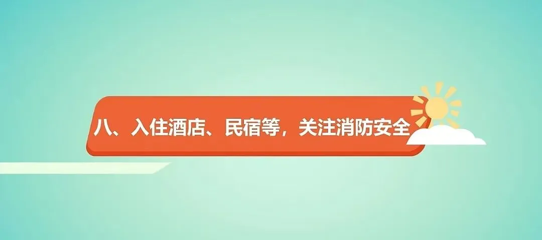 入住酒店、民宿等,关注消防安全。火患无情猛如虎,消防常识要牢记。酒店、民宿入住要了解消防通道位置;明火危险,不要躺在沙发上、床上吸烟,一不小心就回酿成火灾。