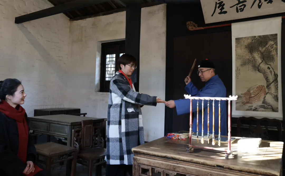 三味书屋旁的“三余书屋”内,私塾先生手持戒尺,重现旧时的读书场景。