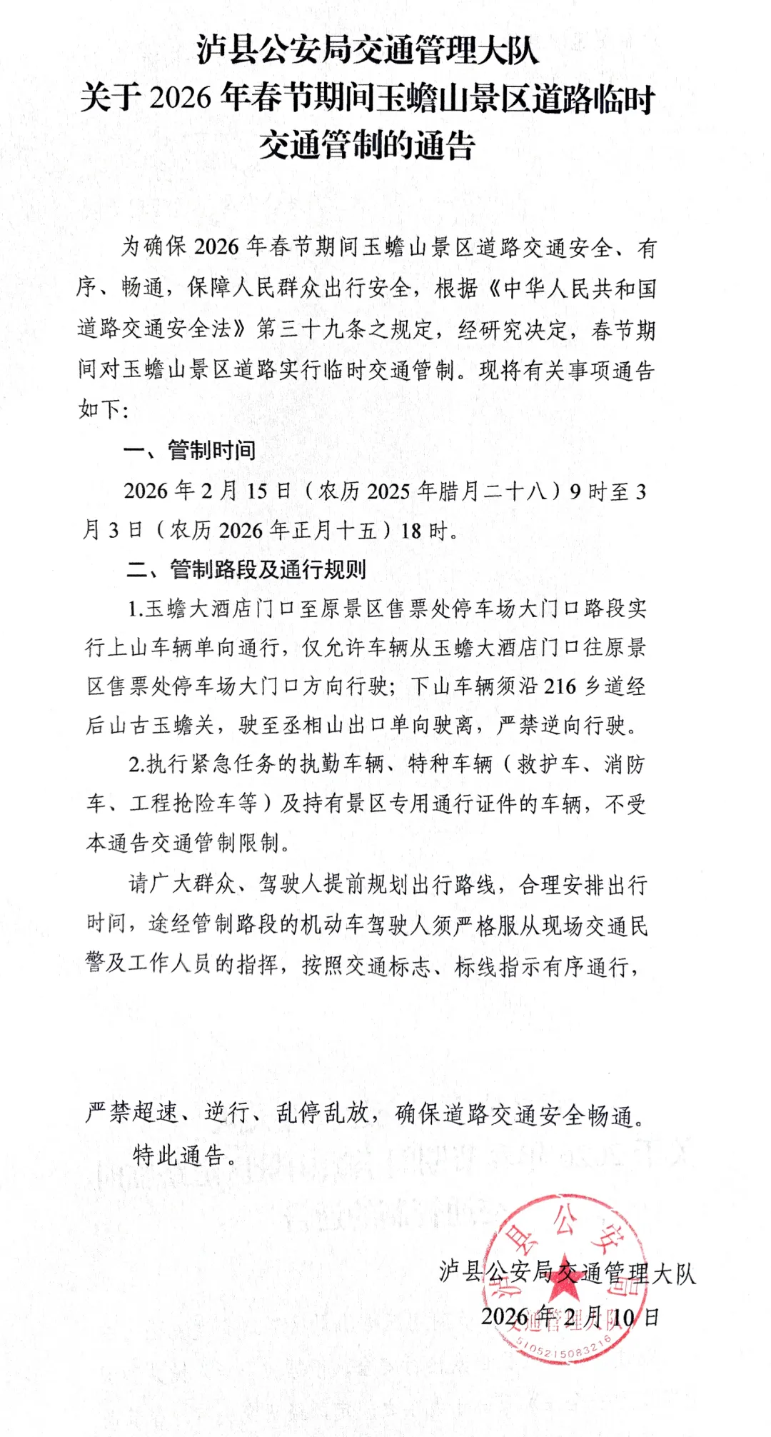 您现在的位置是:首页 > 国内旅游目的推荐 > 正文 国内旅游目的推荐 交通管制 | 2026年春节期间玉蟾山景区道路临时交通管制的通告 admin2026年02月13日 11:53:35国内旅游目的推荐10 交通管制 | 2026年春节期间玉蟾山景区道路临时交通管制的通告来源:泸县公安局交通管理大队 转载请说明来源于"旅荐网",部分内容转载自网络,如有侵权请联系qlwl@foxmail.com删除 本文地址:https://www.15386.cn/post/104655.html 上一篇这里是剑川——既有古城与古镇的人间烟火,也有藏于山水间的小众秘境;既有千年石窟与石雕的厚重文脉,更有活态传承的白族民俗风情。 官宣内测|「剑川旅游」官方小程序上线! 下一篇 天士力大健康城景区春节放假通知 相关文章 你的旅游产品说明书为什么总被投诉?看完这篇,下次不再踩坑! 连休3天��石河子游玩指南已为你安排! 福建环线经典7天自驾旅游攻略 福建自由行攻略 旅行计划 《旅游开发与规划》课程项目式学习成果汇报,专家企业共鉴学生飞跃成长 三亚旅游避坑指南|2026最新版,别让套路毁了海岛度假 夏河到郎木寺,无需攻略,说走就走! 6-7月最佳旅行季!探索甘南6大自然奇观:夏河、桑科草原、郭莽湿地、尕海湖、郎木寺! “金”日攻略|“跑游济宁 一路生花”济宁春日精品旅游线路,解锁孔孟之乡的诗与远方 《旅游避“坑”指南》 发表评论 取消回复 评论列表 这篇文章还没有收到评论,赶紧来抢沙发吧~