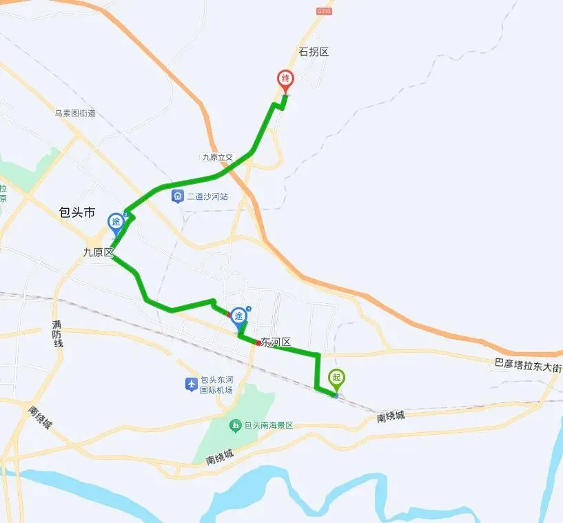 包头东站—南门外大街—和平路—西门大街—内环路—石桥街—北大街—包白公路—开元路—集贤路—包头古城