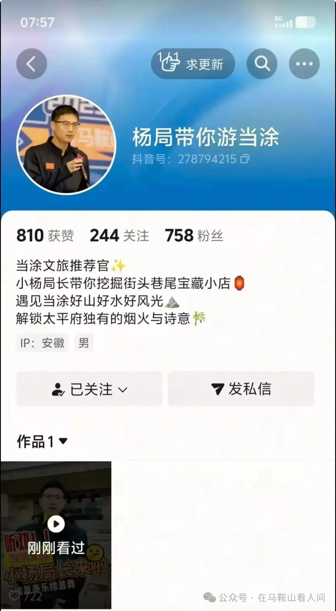 当涂的风,吹过清源门的青砖黛瓦,也吹醒了一座江南小城的文旅初心。最近,马鞍山当涂文旅局的小杨局长,在抖音正式开号,以“杨局带你游当涂”的身份,亲自下场做代言人、当文旅推荐官。有人调侃,这位局长是在“出卖自己”,放下身段、抛却刻板、直面镜头,把公职身份揉进烟火日常,把政务形象变成行走的名片。可越是细品,越能读懂:他所谓的“出卖”,从来不是妥协,而是一场以真心换真心、以热爱赴使命的深情奔赴。