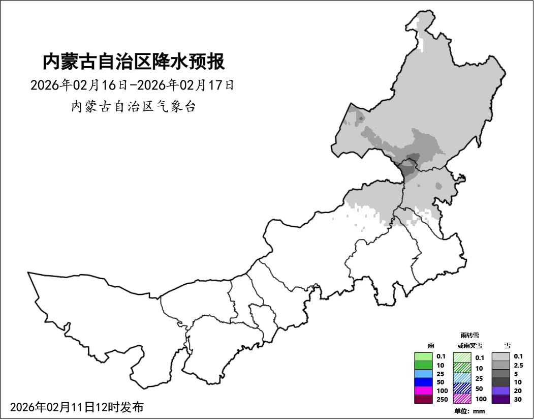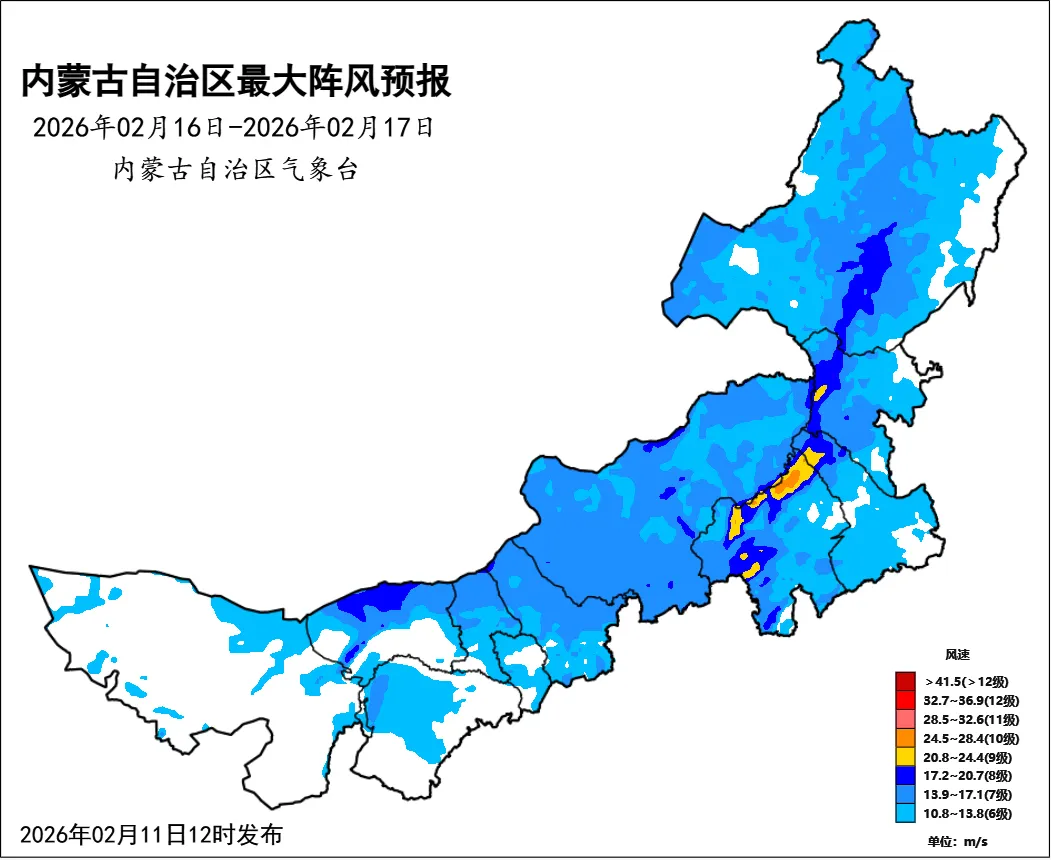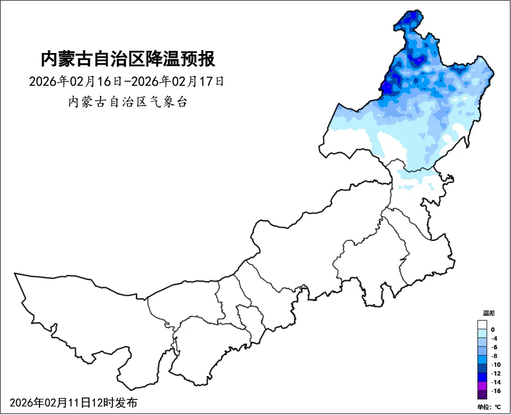 2月16日夜间至17日,中部偏东和东北部地区有分散性小雪,其中,兴安盟西北部、呼伦贝尔市西南部有中到大雪;东北部地区气温下降4到8度,呼伦贝尔市北部地区气温下降8度以上;西部偏北、中东部大部地区4、5级短时6、7级偏西风或西北风,其中西部偏东北和大兴安岭沿线阵风可达8级以上。