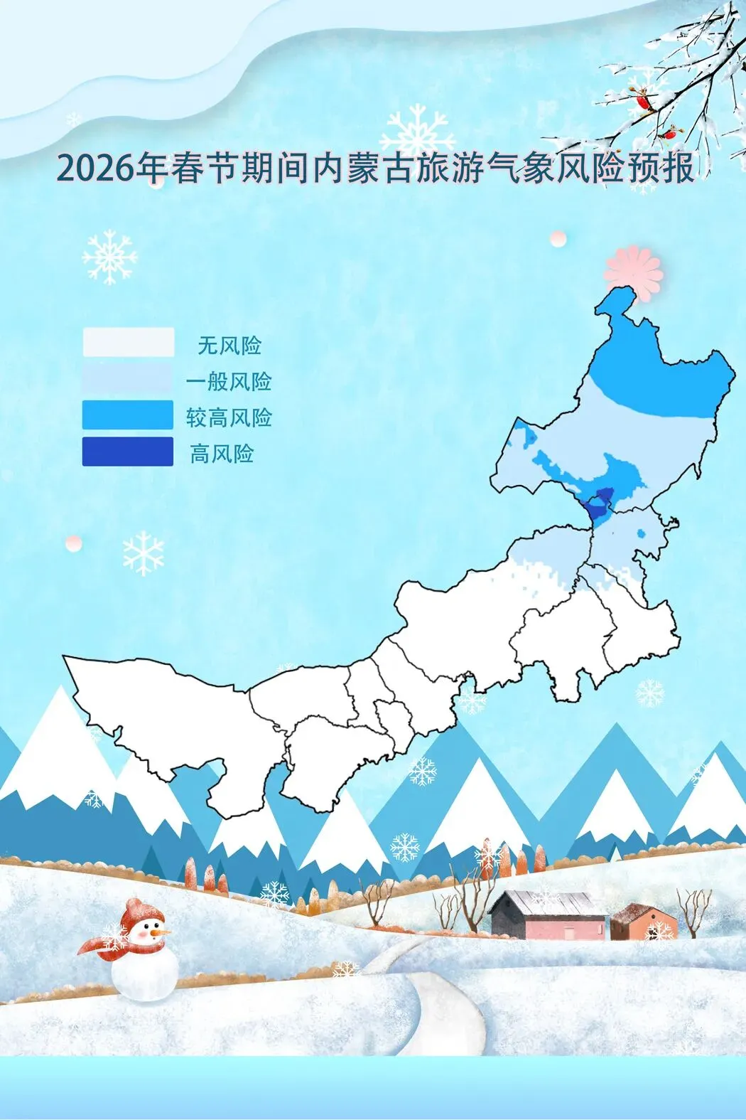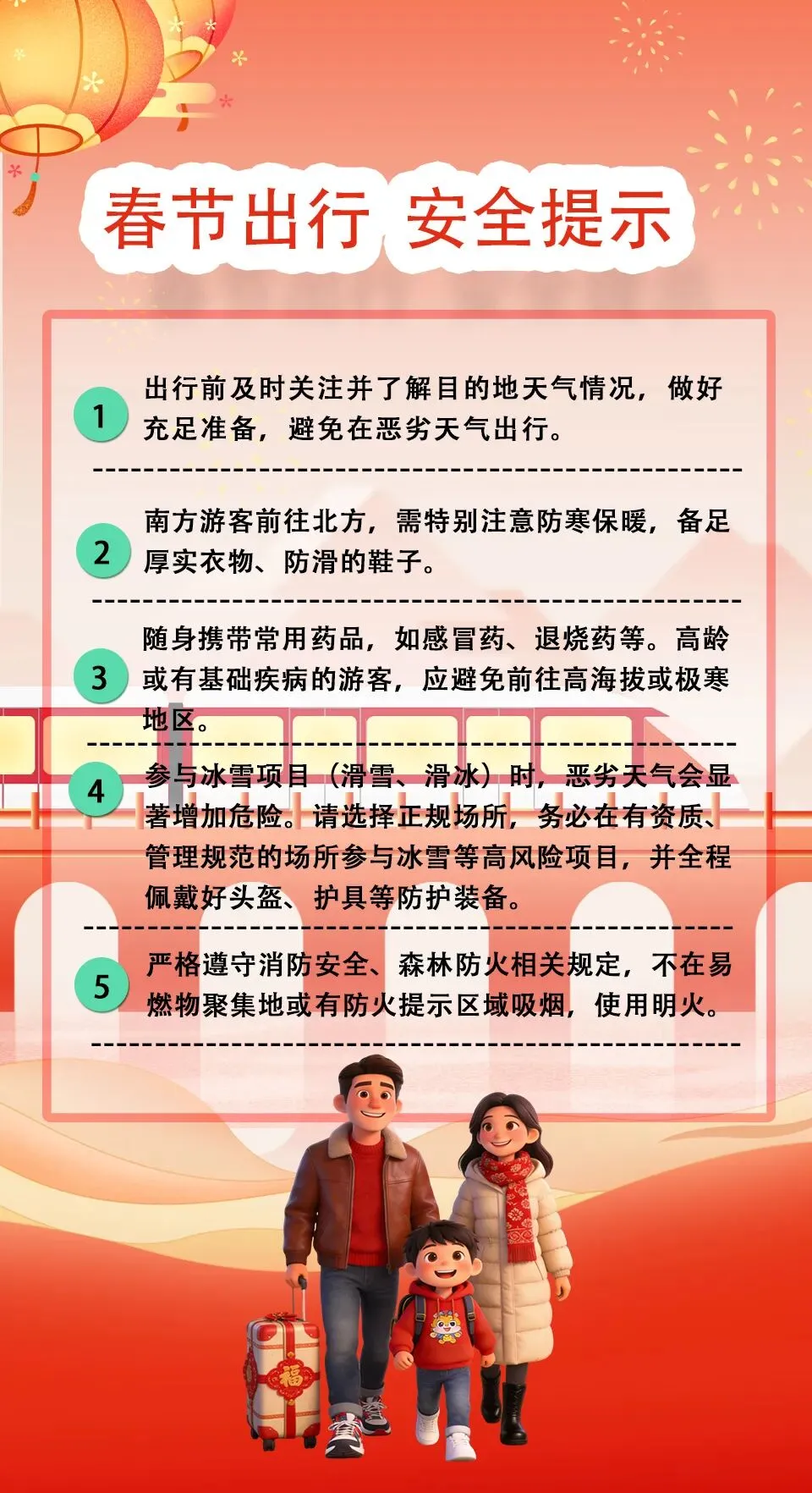 春节期间,天气原因对局部地区旅游出行会有一定影响。其中,2 月 16 至 17 日,中部偏东和东北部地区有降温和风雪天气,对东北部的旅游活动有一定影响;2 月 18 至 20 日,风沙有可能会对中西部的旅游活动有所影响;降雪对中部偏东和东北部地区旅游活动有一定影响。其它时段,基本适宜开展旅游活动。