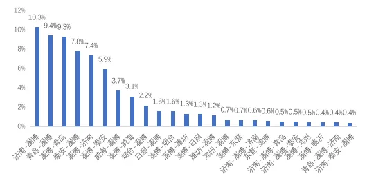 流量经济驱动旅游供给和需求要素的重新组合、集聚和扩散。目的地城市利用流量获得游客注意力,进而通过网络促销热点吸引游客前往旅游目的地,带来了旅客运输、宾馆住宿、旅游观光、购物饮食等多个领域的蓬勃发展[9]。淄博烧烤是近期国内文旅市场中目的地凭借美食提升城市旅游吸引力的最典型案例。美团平台数据显示,2023年“五一”节前,“淄博烧烤”关键词的搜索量同比增长700%,大众点评相关笔记数同比增长1400%。假期期间,淄博全市餐饮堂食消费较2021年同期增长360%,酒店住宿与休闲娱乐消费分别同比增长490%和1156%。这些数据表明,餐饮消费对当地文旅整体拉动作用显著。烧烤热不仅为淄博带来了直接的客流与消费,也使其成为山东省旅游流量的新入口,优化了其在全省旅游目的地城市体系中的生态位。2023年“五一”假期,到访山东的省外游客中有7.6%曾到访淄博,而2019年同期该比例仅为2.0%。同时,以淄博为客流流出端,到访淄博的游客中有26.5%在假期内还前往了山东其他地市,较2019年同期的6.8%大幅提升。这说明淄博与省内其他城市的旅游客流交汇显著增强。进一步分析显示,约两成游客将淄博作为山东省内旅游的第二站。淄博有效承接了来自济南、青岛等交通枢纽的省外中转客流,其在山东旅游客流网络中的中心度明显提升。以淄博为中心的省内旅游流线图(图2)直观展示了这一变化,印证了流量经济下旅游要素重新组合与扩散的实际效果。