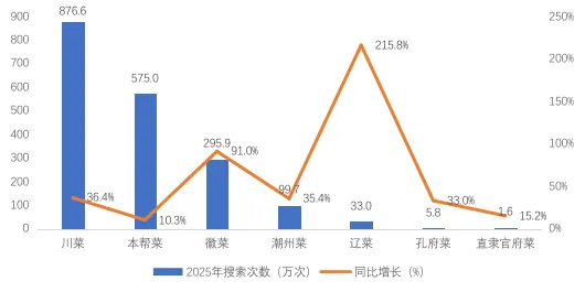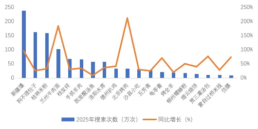 根据对国家级非物质文化遗产代表性项目名录中美食相关项目的监测,各非遗申报地区的非遗美食游客关注度正持续攀升。具体数据显示,2025年非遗美食菜系在大众点评平台的整体搜索次数同比增长了34%(图5-1),其中辽菜的搜索热度同比激增215.8%,显示出地域特色美食的巨大吸引力。非遗地方小吃与特色美食的搜索次数也同比增长了50.9%(图5-2),诸如新疆馕、天津狗不理包子、桂林米粉、兰州牛肉面等热门非遗小吃,在其申报地区当地的搜索量均超过百万次,北京烤肉、兰州牛肉面的搜索量同比增长均超过100%。线上关注度的飙升直接转化为实际的经济效益与跨地域的文化传播,2025年,非遗美食商户有过线上餐饮消费记录的省外游客量同比增长了14.7%,省外游客的餐饮订单量更是同比增长了37.1%。这种由“线上关注”到“线下体验”的转化路径,不仅为地方带来了经济收益,更在游客的亲身参与中完成了文化的深度体验与传承。