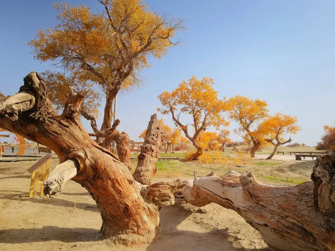 该景区三面环水,拥有独特的地理位置和自然景观。景区内的天然胡杨林面积达1.8万亩,形成了胡杨、水、绿洲、戈壁四位一体的自然风貌。这种独特的地理环境为游客呈现了一幅塞外边疆的美丽画卷。金胡杨风景旅游区不仅自然风光优美,还具有丰富的历史人文景观。这里曾是古代战场,唐代时属于阗国领土,盛行佛教,留下了许多珍贵的历史遗迹。此外,金胡杨风景旅游区还是各种野生动物的栖息地,生态环境良好,四季景色各异。春天百鸟欢歌,生机盎然;夏季浓荫蔽日,杂花生树;入秋黄叶如染,如诗如画;冬日银装素裹,满目苍劲。