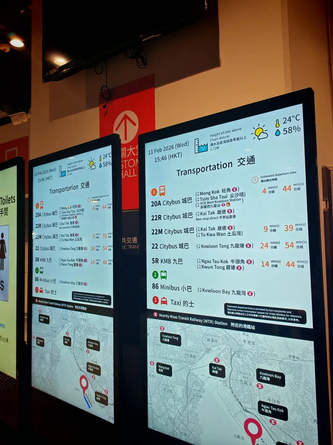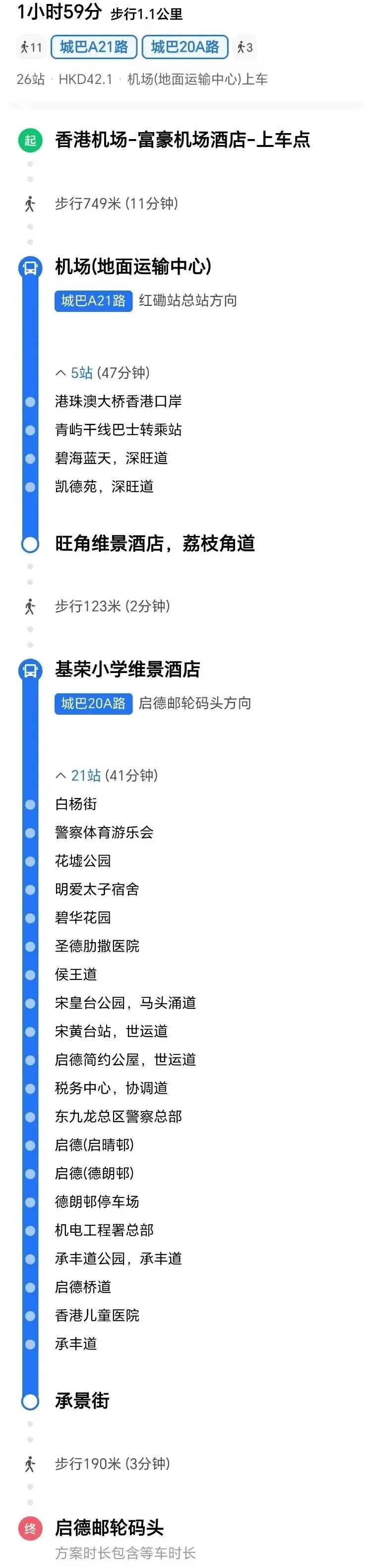 言归正传,讲讲这次邮轮游。这次邮轮游从香港登船,邮轮公司有免费的接驳车从广东多个点接送至香港启德邮轮码头。由于车票需要抢,并且车程长,还要过关,不确定因素太多,我决定直飞香港,自己去邮轮码头。订了2.3早上7点多的飞机,带着我的小旅游搭子10点不到就到香港机场了。距离下午13:30开始办理登船的时间还早,就决定坐公共交通前往码头。根据高德地图提供的线路,我决定坐A21转20A,这条线路走路最少。出了机场不远就是巴士总站,根据提醒很快就找到了A21路巴士。