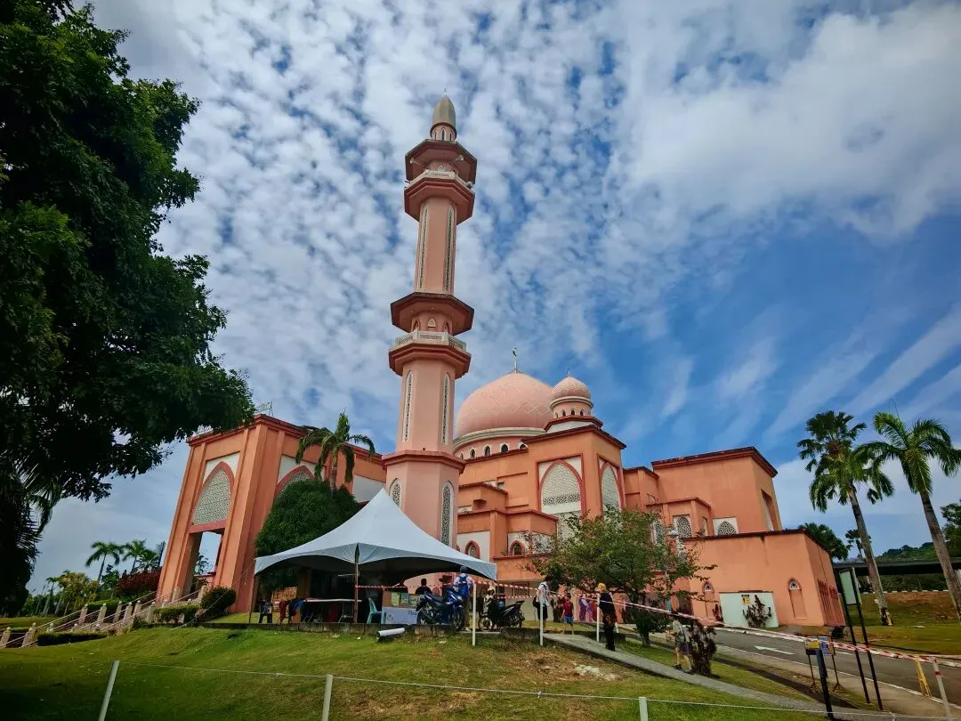 拍好照,坐了一会,继续打车去沙巴大学看粉红清真寺。同样的打车程序,这次的司机很不错,由于我打车目的地写的是沙巴大学,上车后才知道沙巴大学特别大,司机问我具体想去哪里。我当时并不知道粉红清真寺在当地的准确名字,只好找了一张网图给司机看。司机一看就明白了,还告诉我这个地方叫Pink Mosque。然后就哼着歌载着我们进了沙巴大学,到达了粉红清真寺。(有攻略说进沙巴大学前司机会停车让游客去买进校门票,10林吉特一个人)但我们这个司机直接把我们送到了大学里面,根本没让我们去买票。