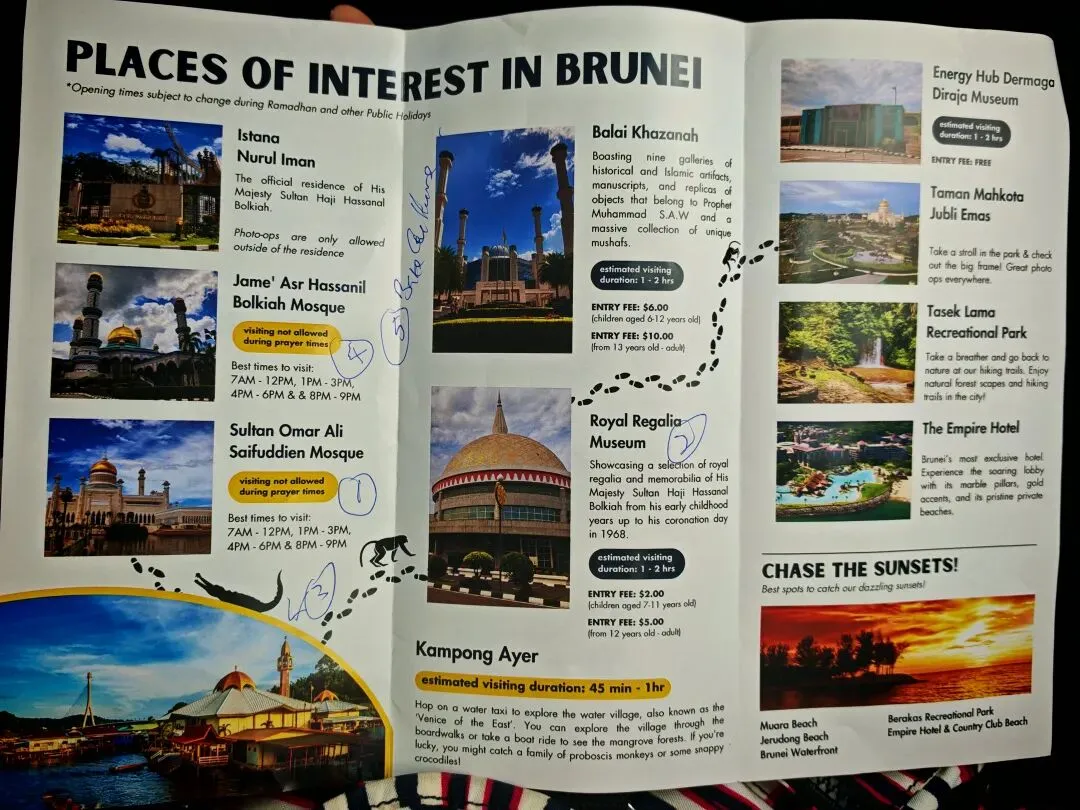 我和娃准备包车,但觉得两个人一辆车不大划算,于是在那等了一会准备找人一起包车。这时正好有一家四口来了,在门口犹豫不决。我就上去提议一起包车。他们说正好没方向,我说我有做攻略,于是决定一起包车。我们6个人包了一辆车,4个小时135文莱元,可以刷卡也可以现金。很幸运,分配给我们的司机会说中文,并且人也很好。三个小孩坐后排,三个大人一人一个独立座椅,完美!和司机沟通好去的地方,我们就向市区出发了。