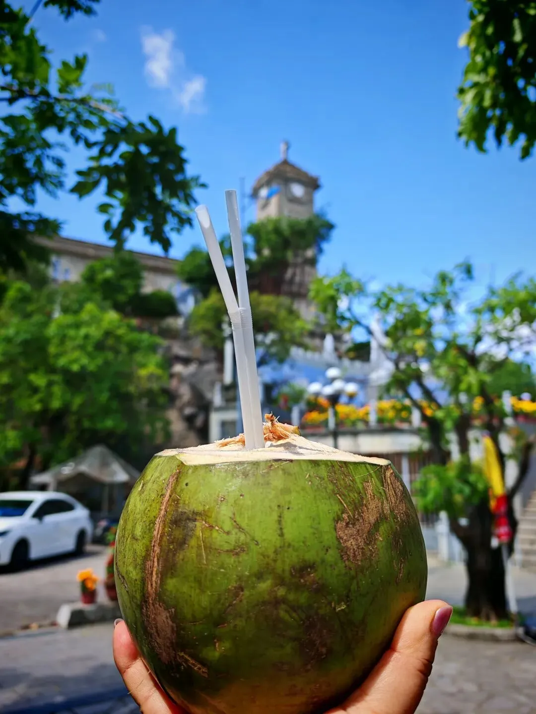 到了芽庄大教堂,就被边上卖椰子的人叫住了,2万盾买了个椰子,很好喝,吃完还帮切开吃椰子肉,服务很好!