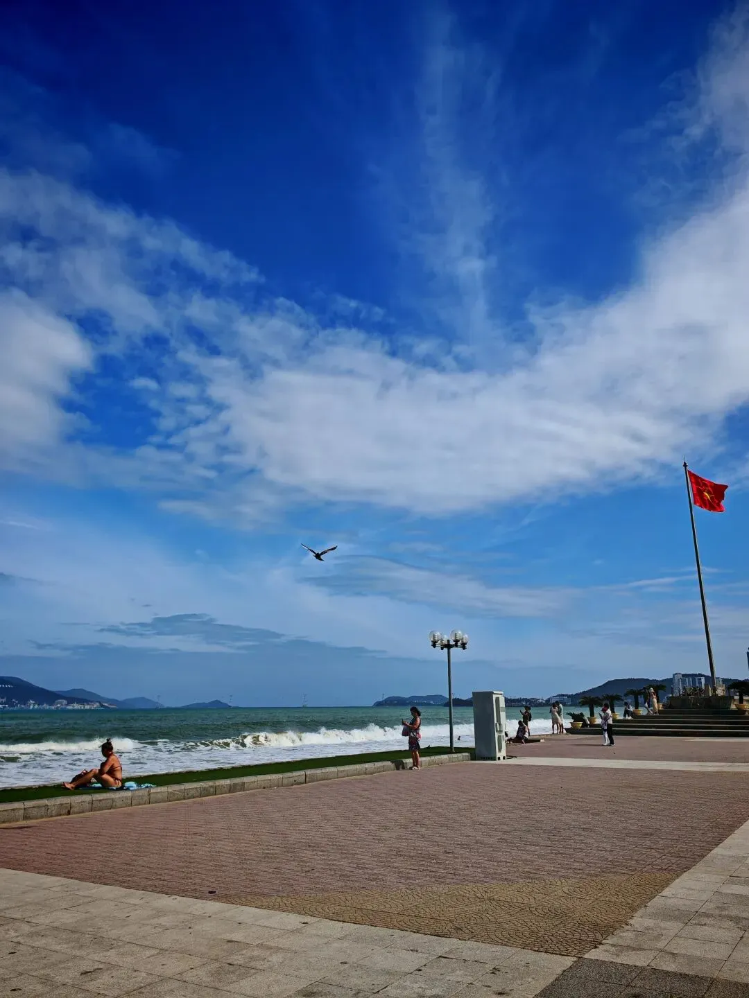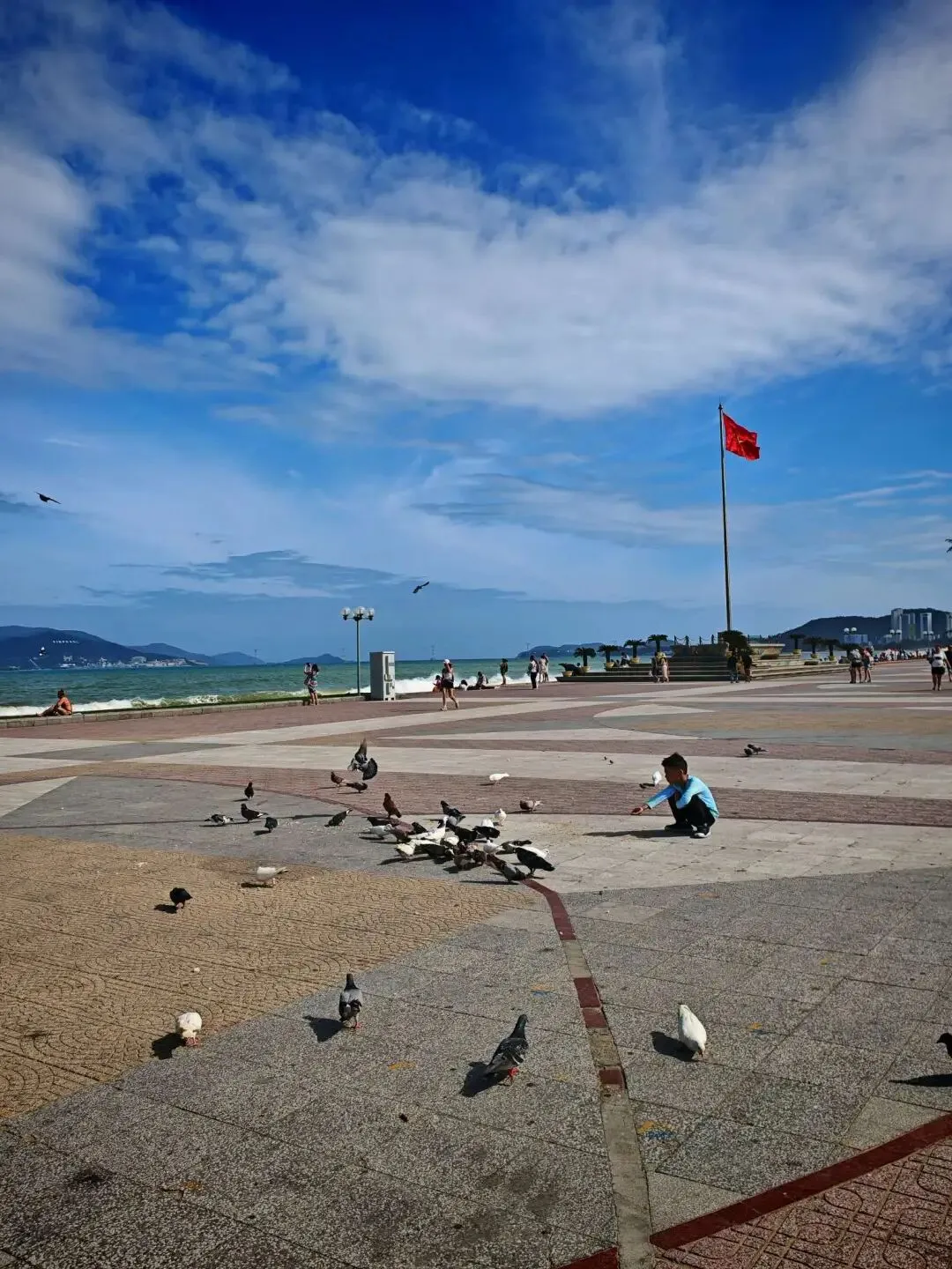 然后过马路到沉香塔前拍个照。边上的24广场上好多鸽子,再边上就是海岸沙滩。好多欧美人在晒太阳。插播一条芽庄过马路指南。芽庄的红绿灯很少,路口有人行道线,不一定有红绿灯。我们第一次过马路的时候,看着四面都是车子不知如何是好,正好有一对当地老夫妇也要过马路,看出了我们的窘迫,示意我们跟着他们过马路。只见他们举起一只手,边上的车就开始避让了,然后就举着手走到了马路对面。